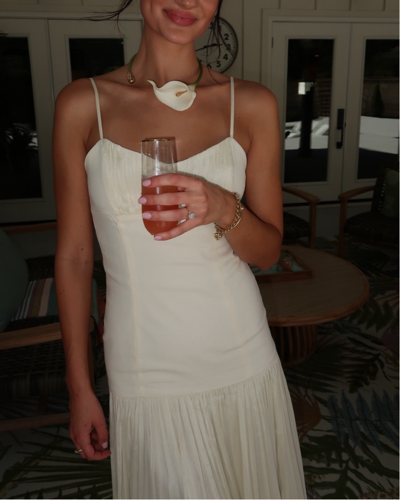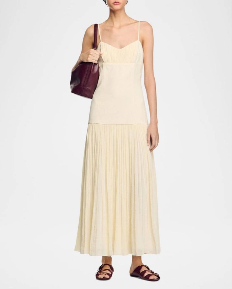 Gorgeous cream colored Sandro dress worn once for bridal event! I also have the Cult Gaia choker it was styled with💚 please note: this dress was taken in slightly at the waist, I am shown wearing it in the first 3 photos- this is how it fits now vs. the more straight waist of the original dress.
