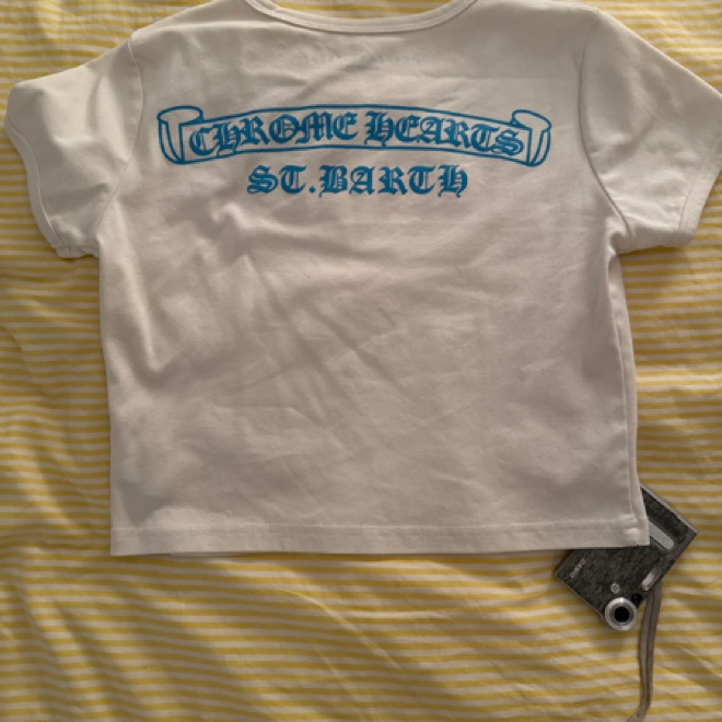 Chrome Hearts St. Barths baby tee purchased from the St.B Location. Size Medium but fits a small/xs. So cute and the older version of the shirt so its thicker and not see through. Please be careful! its super white.