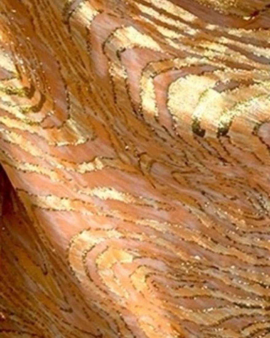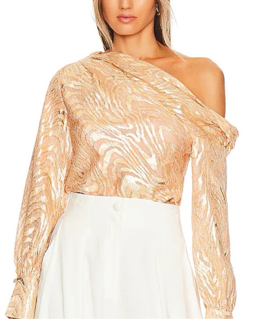 This eye-catching metallic blouse is perfect for a night out or special occasion. The one-shoulder design adds a touch of glamour. The colors are gold and apricot.