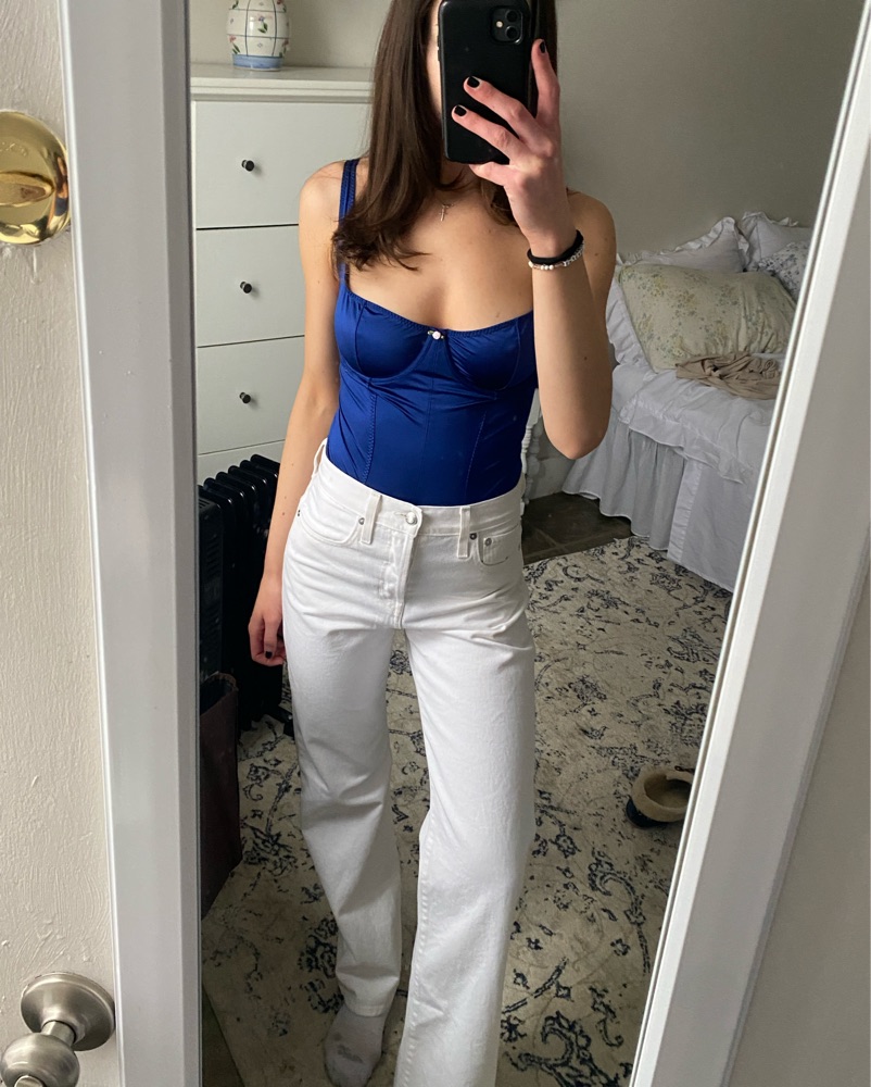 This top is tea. Beautiful bright navy stretch satin bodysuit. The rose fell off fyi - I honestly like it better that way