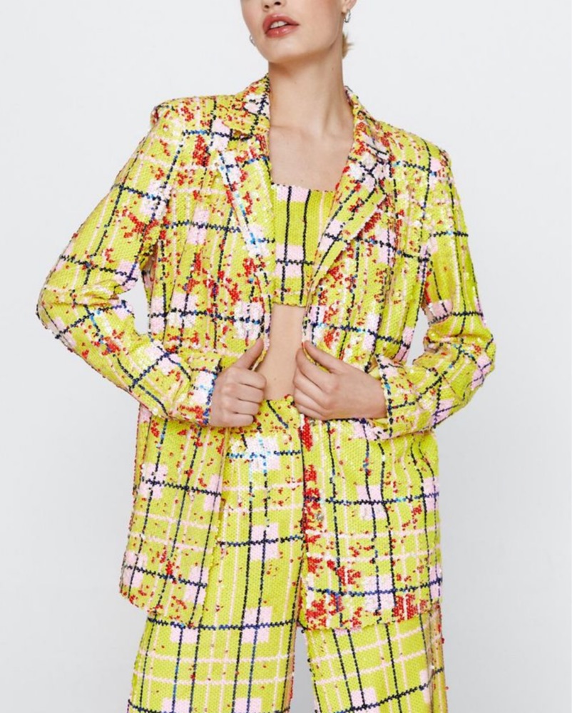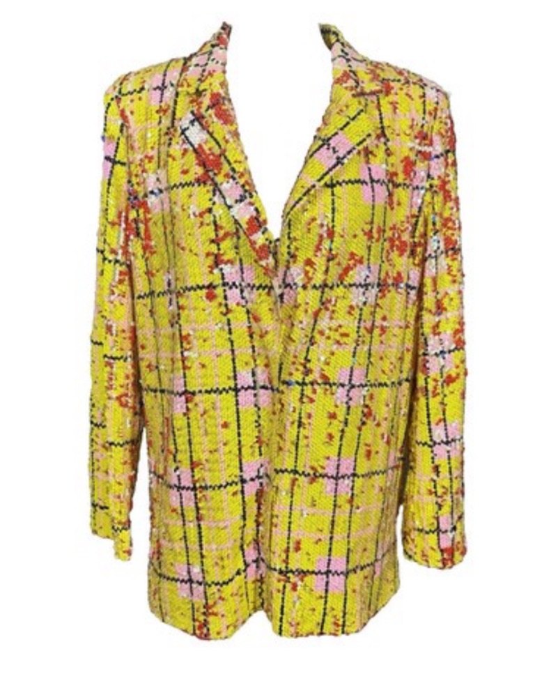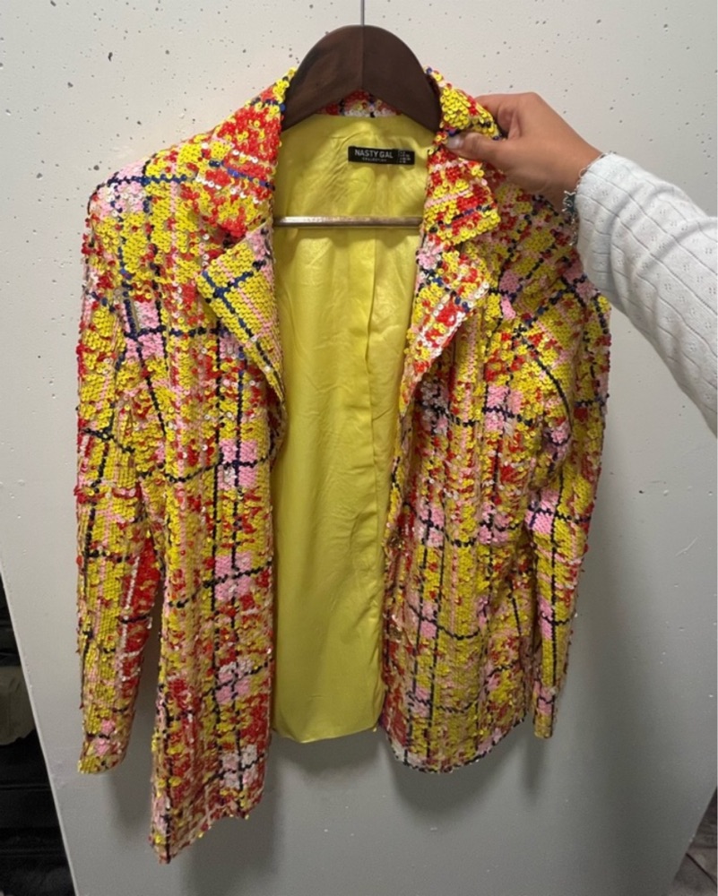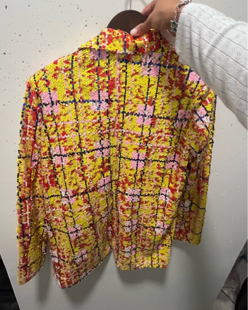 This statement sequin jacket is perfect for a night out or special event. The bold floral print and reflective sequins add a touch of glamour to any outfit.
