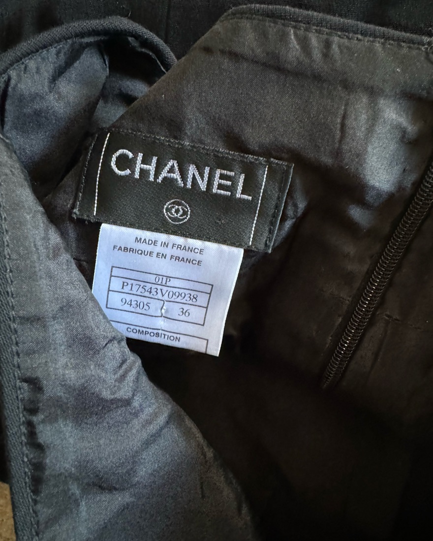 Authentic Chanel with micro CC logo plate black Chanel skirt. Fit is bet pencil & A-line with length between thigh and above knee depending on height & skirt placement. Zip closure in back. Size 36 fits like size 2 (if looking for business fit recommend typical size 0-2. Going out or sexier look 2-4
