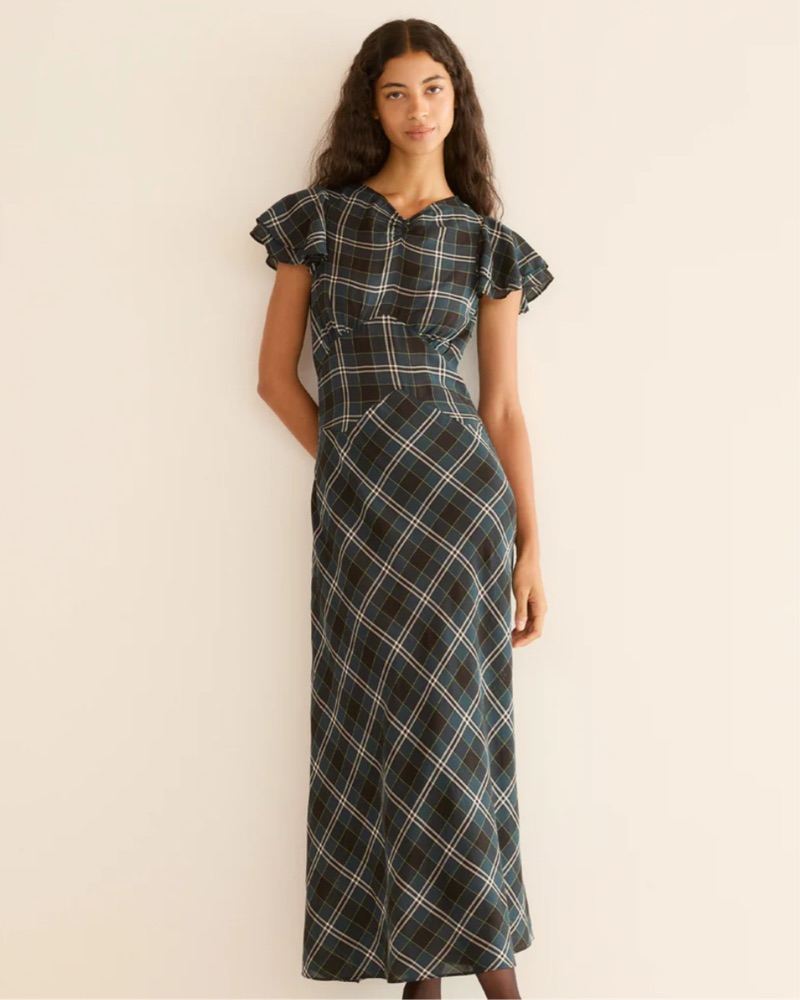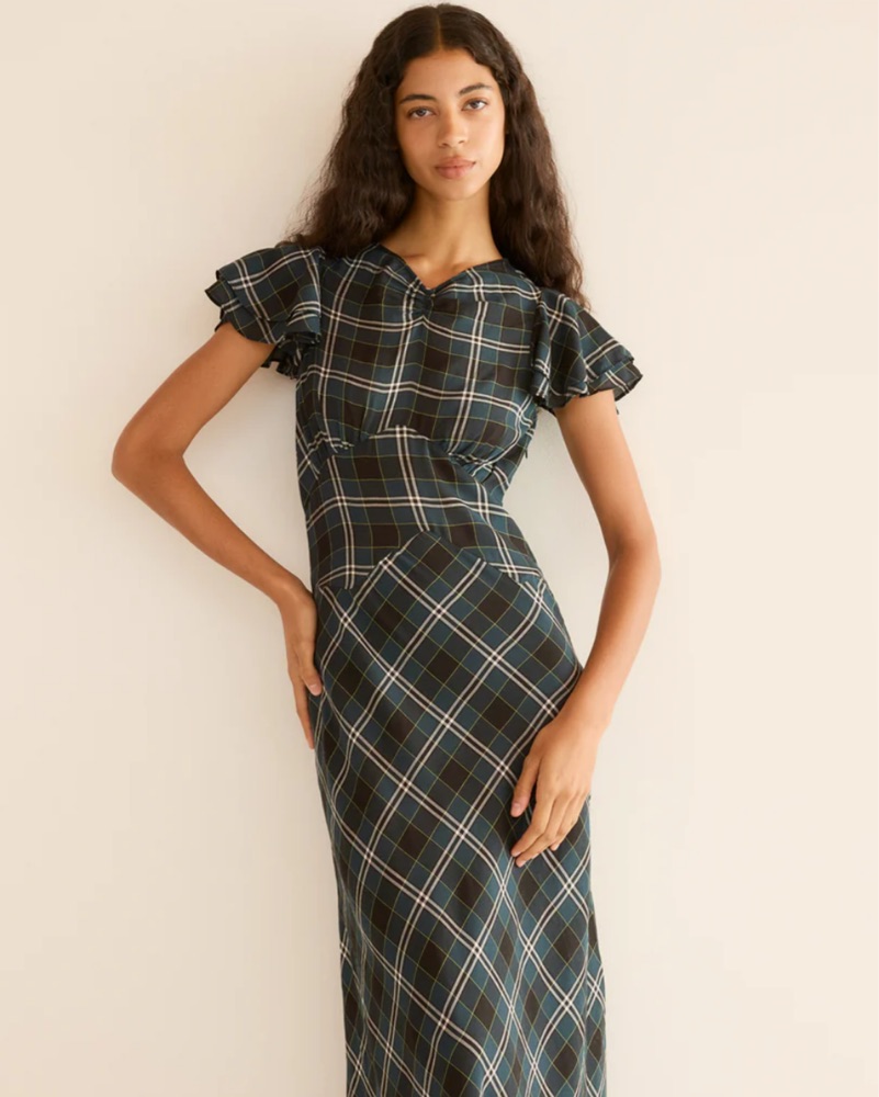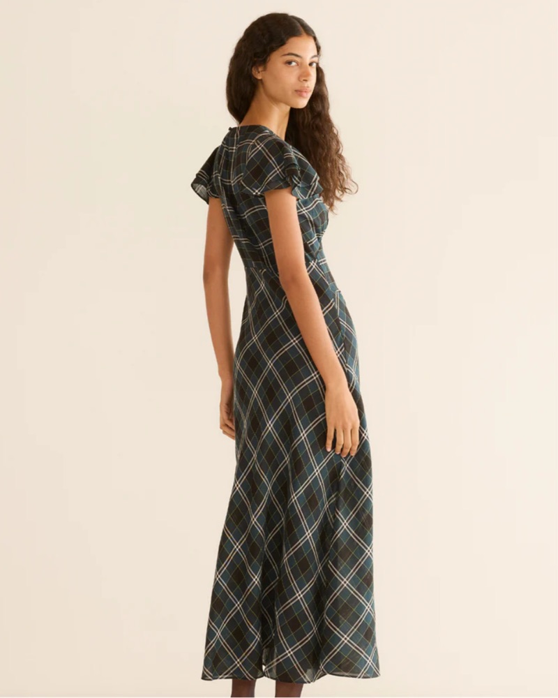 Rendered in soft organic cotton voile and patterned with our yarn-dyed Amble Plaid, the Seraphine Dress draws inspiration from our beloved Rhodia. A high V-neckline with short flutter sleeves is framed by delicate ruching and pointed underbust seams for subtle structure, while a single covered butto