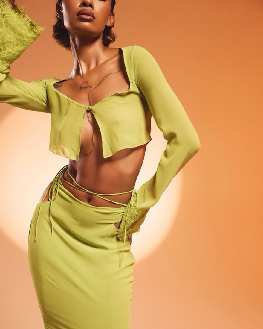 As seen on @karaditta! Tara crop top and Madeline maxi skirt in lime green. Included is a Honey Birdette lime green bralette that the model is also wearing! Size 32A. You’re welcome to wear your own bralette as well!