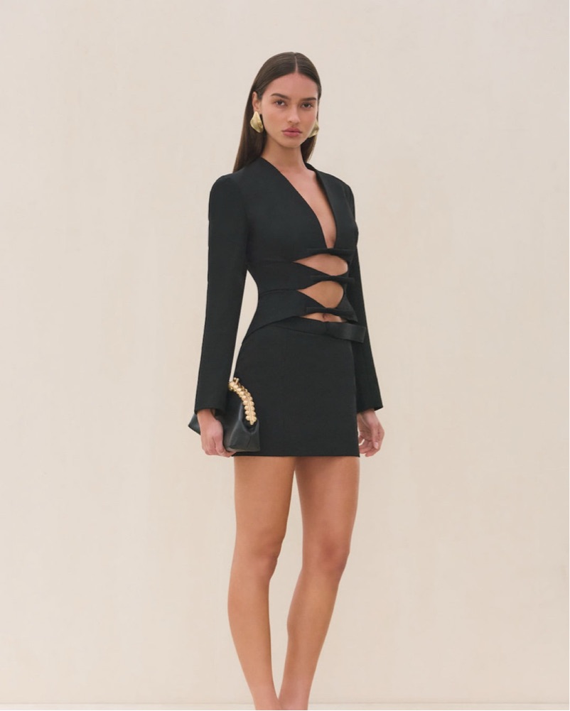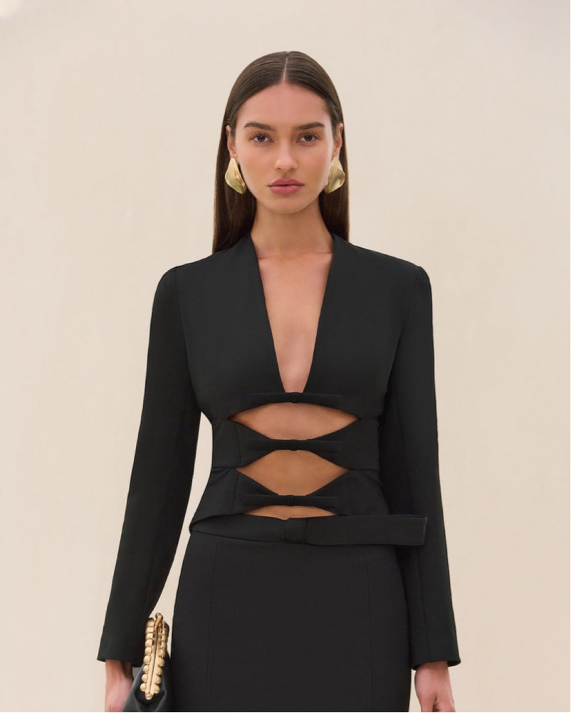 A long-sleeve blazer top with a deep v and center cutouts. Pair with a micro mini or cutout jeans for a full look!