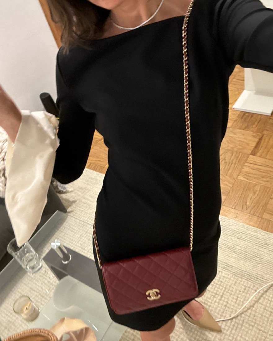 Boatneck Long sleeves, flare cuffs Concealed back zip closure