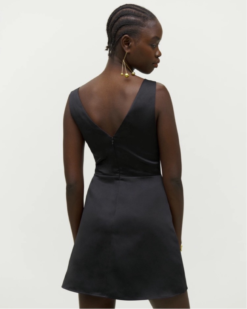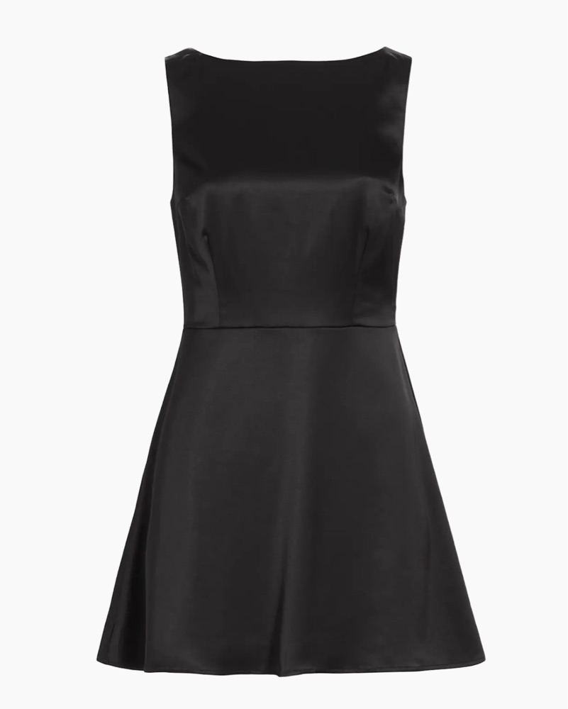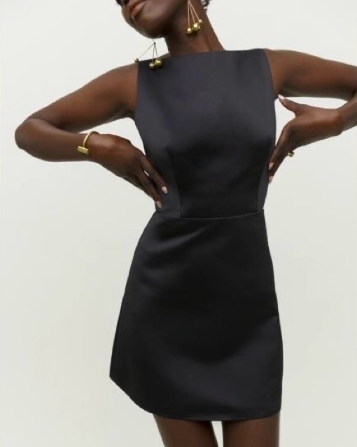 Reformation satin, black, boatneck mini dress