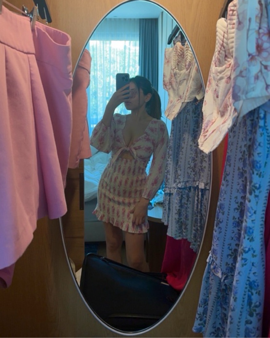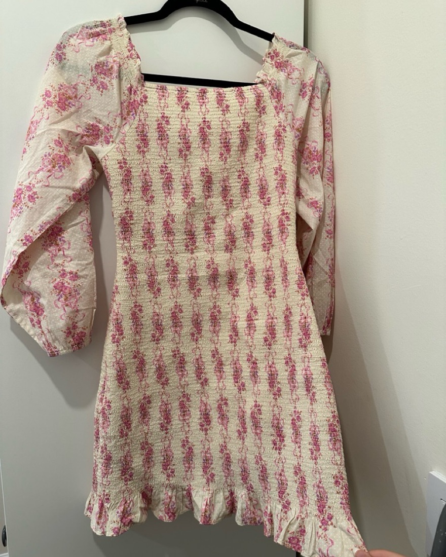Addorable dress perfect for vacation or day out in spring. The dress material is stretchy so very comfortable, the top area is a bit adjustable as the front can be tied to your preference. The color is an off white / cream and pink color. I wore it once on vacation and received a ton of compliments!