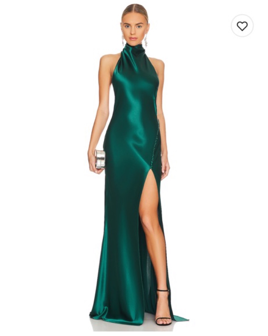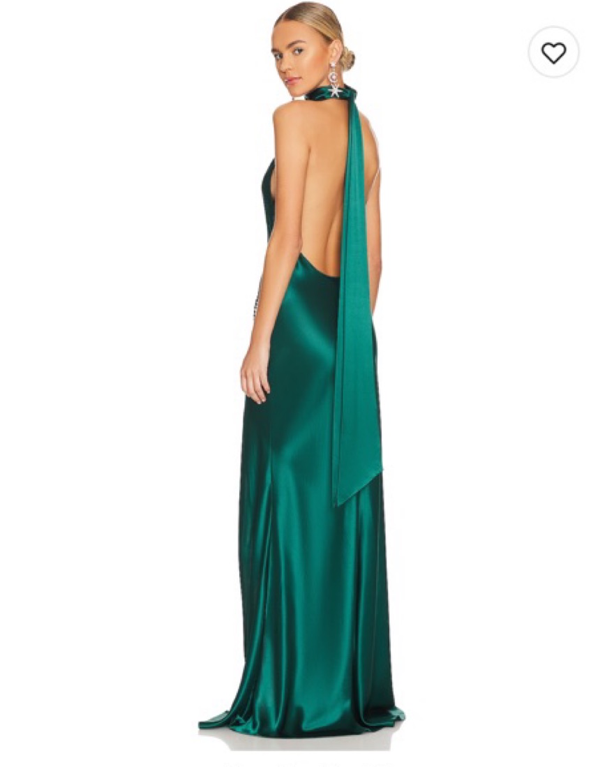 This gorgeous gown features an oversized halter neckline with wrapped buttons and a flattering leg slit. Its perfect for a black tie occasion. I wore it to a wedding in Italy. Minor staining- can send photos if needed.
