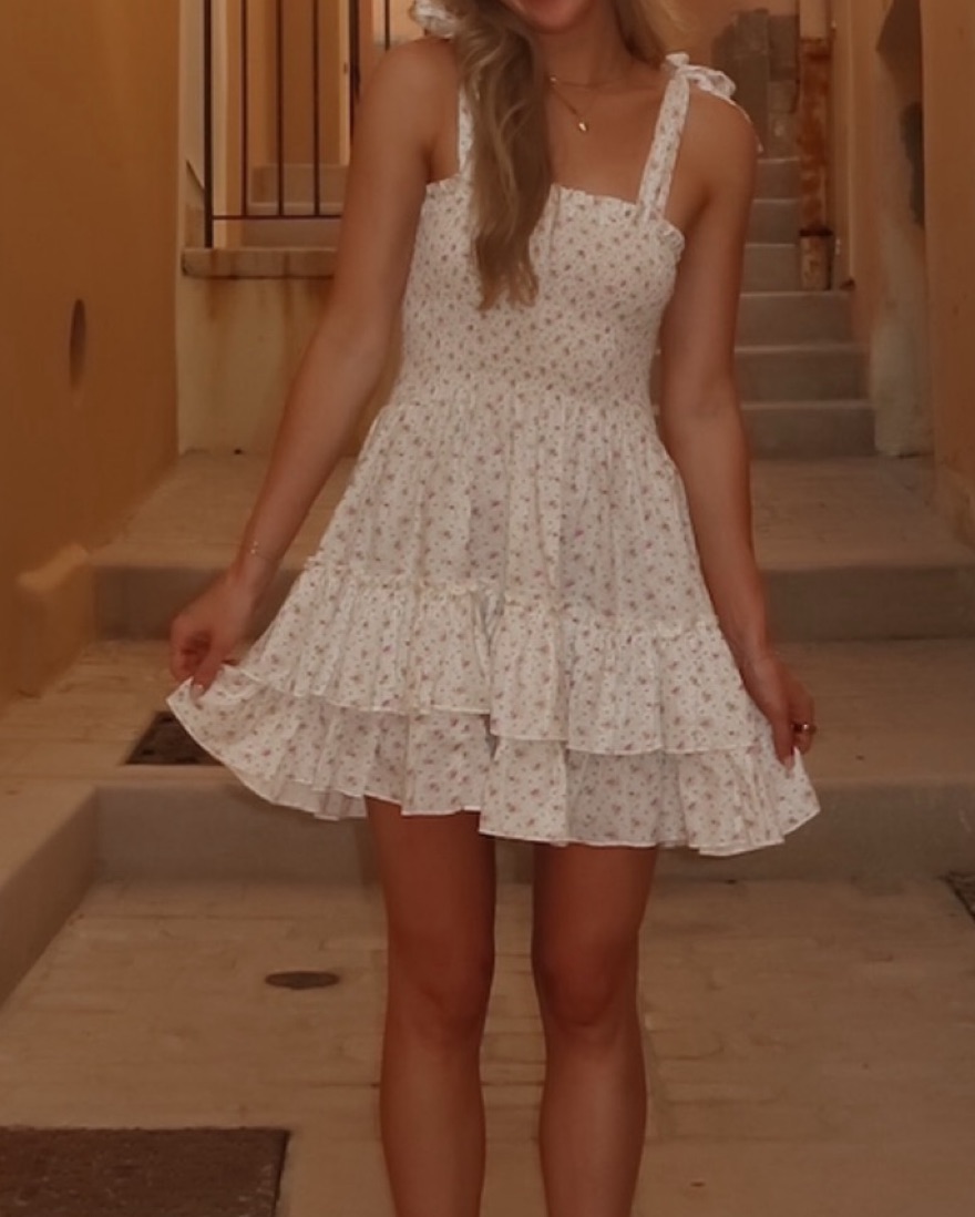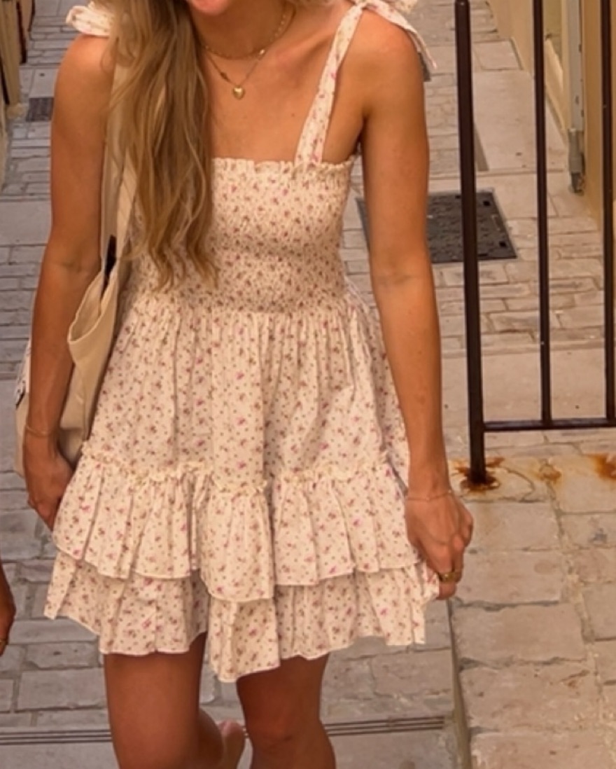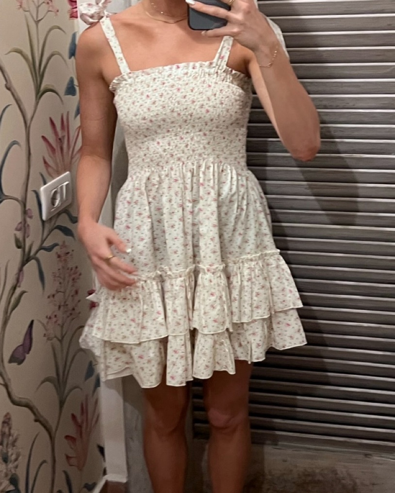 Mini floral dress from the viral CB positano store — perfect for summer in Europe, beach vacation, brunch, etc. ruching cinches you in & makes this dress flattering on everyone 🌸