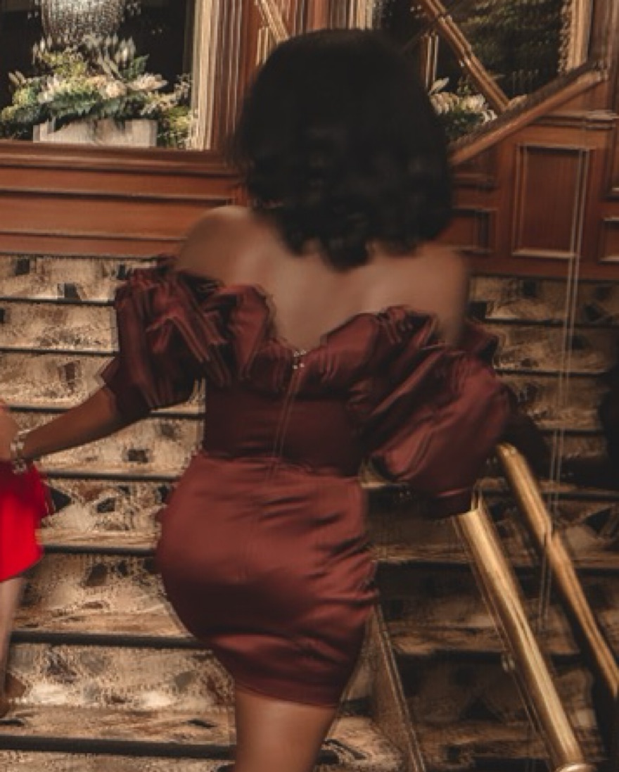 This exquisite brown satin dress is perfect for a night out on the town. The dramatic puff sleeves and figure-hugging silhouette create a romatantic and dramatic look.