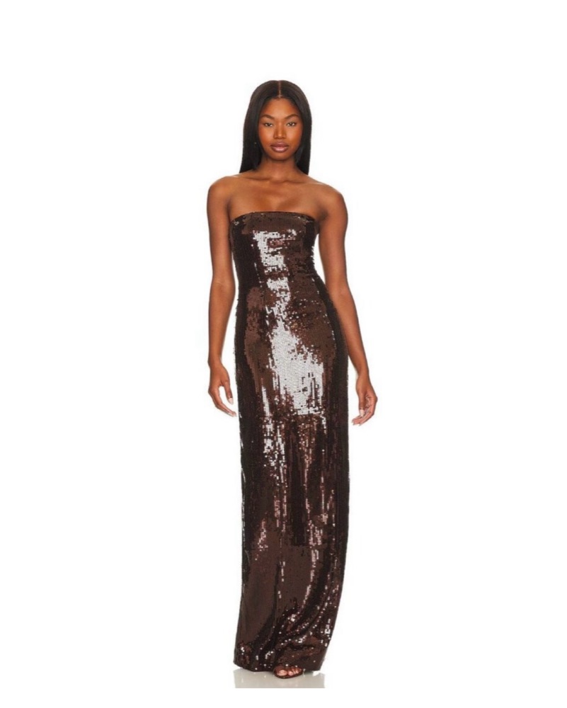 Evoke cutting-edge style in our Ember Dress. This strapless maxi dress features an all-over sequined bodice, coordinating skirt, and flowing hem. Shown here in Dark Chocolate.