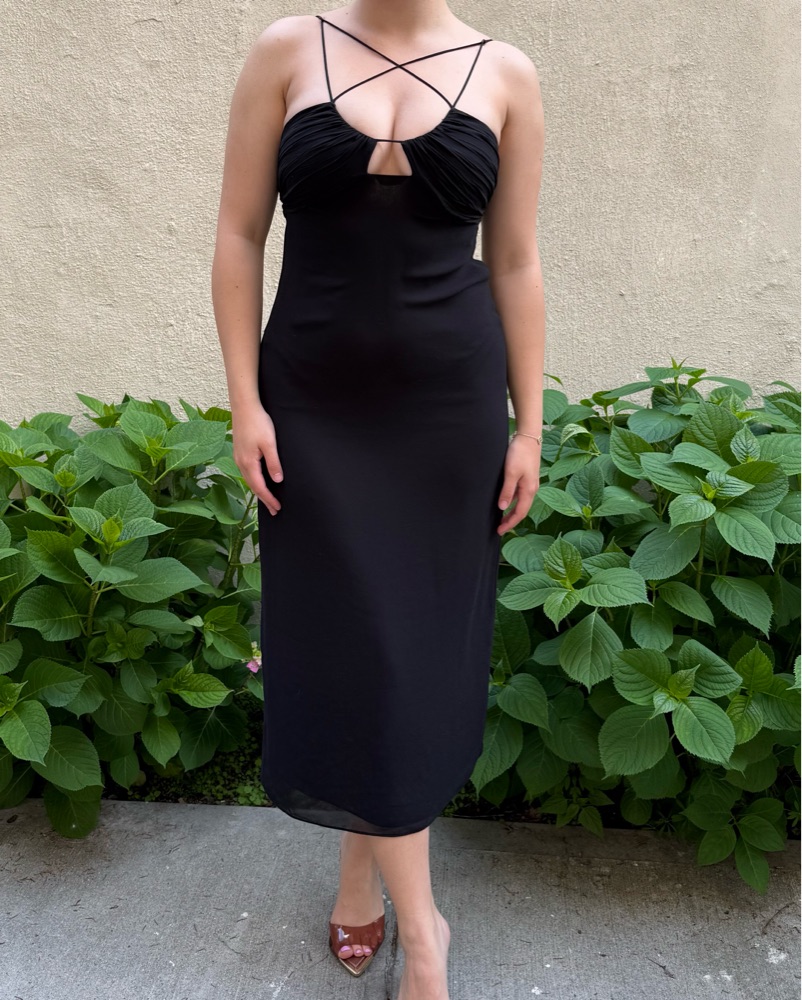 This sleek and sophisticated black midi dress is perfect for a formal event or special occasion. The ruched detailing adds a chic and flattering touch.