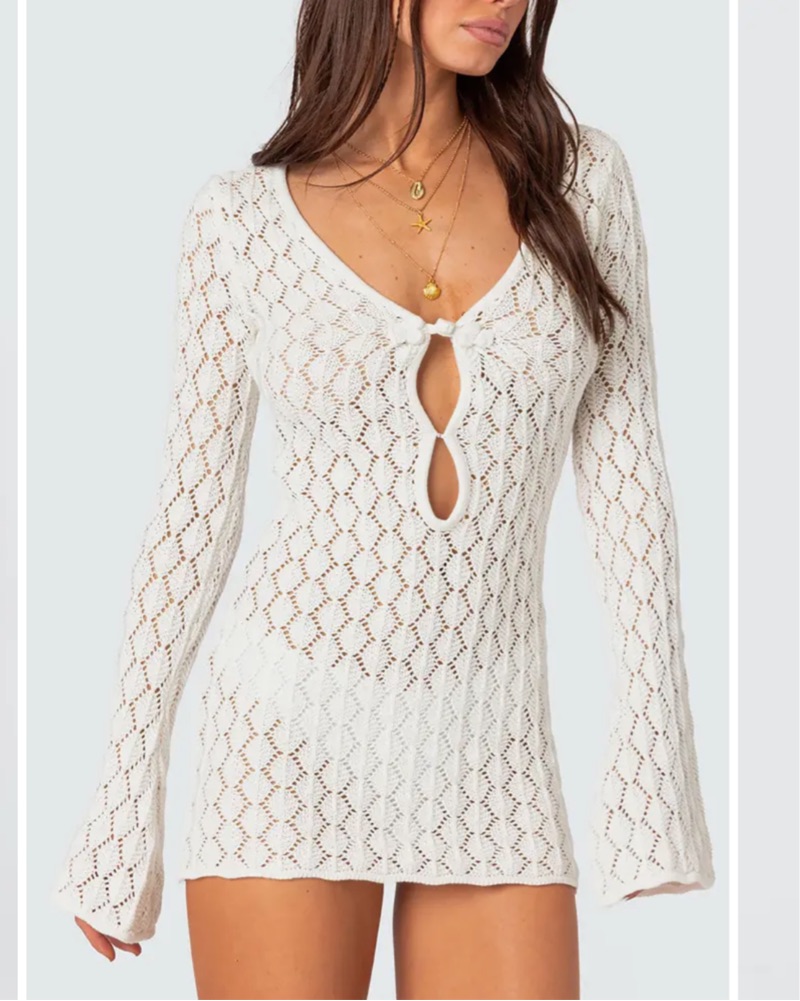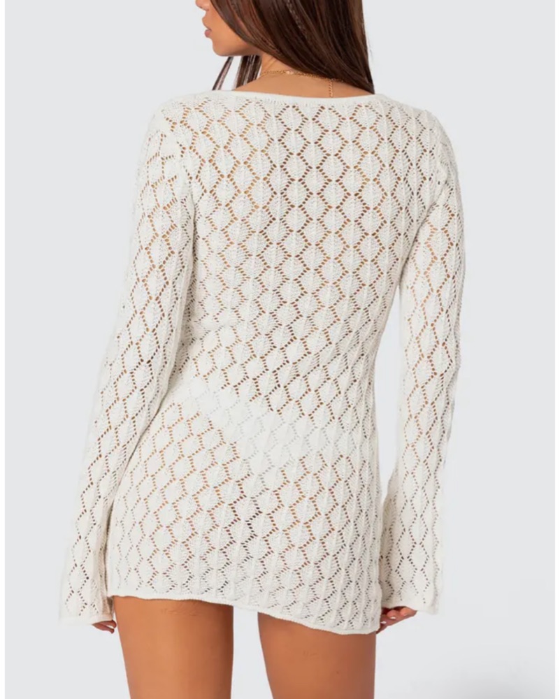 This stunning crochet romper is the perfect choice for a summer night out or a beachside getaway. The intricate lace pattern and flared sleeves add a touch of elegance and bohemian charm.
