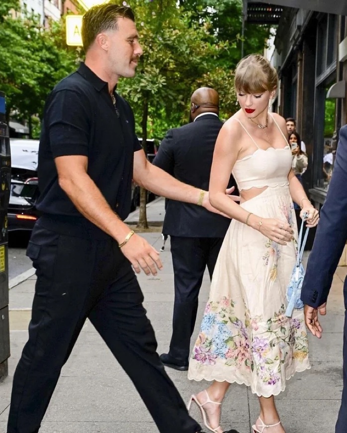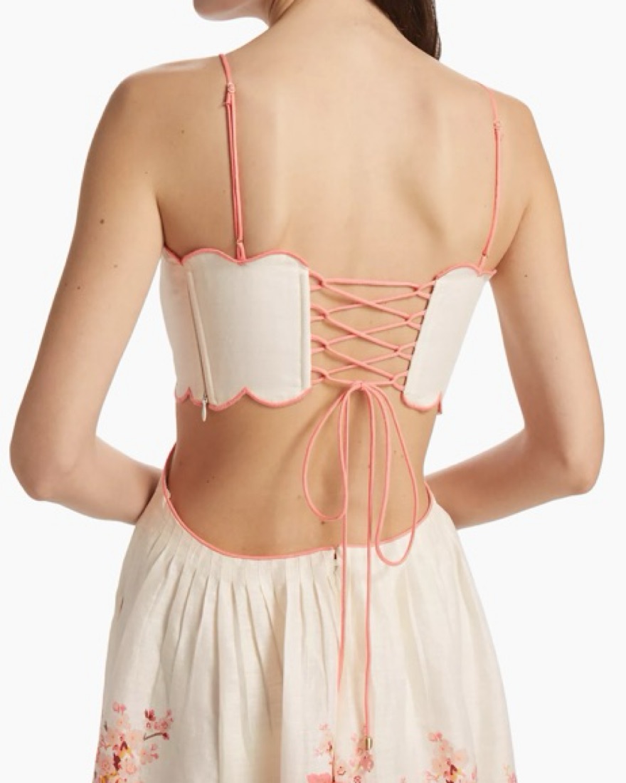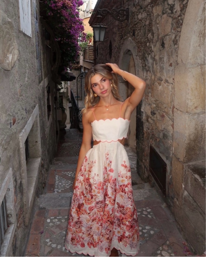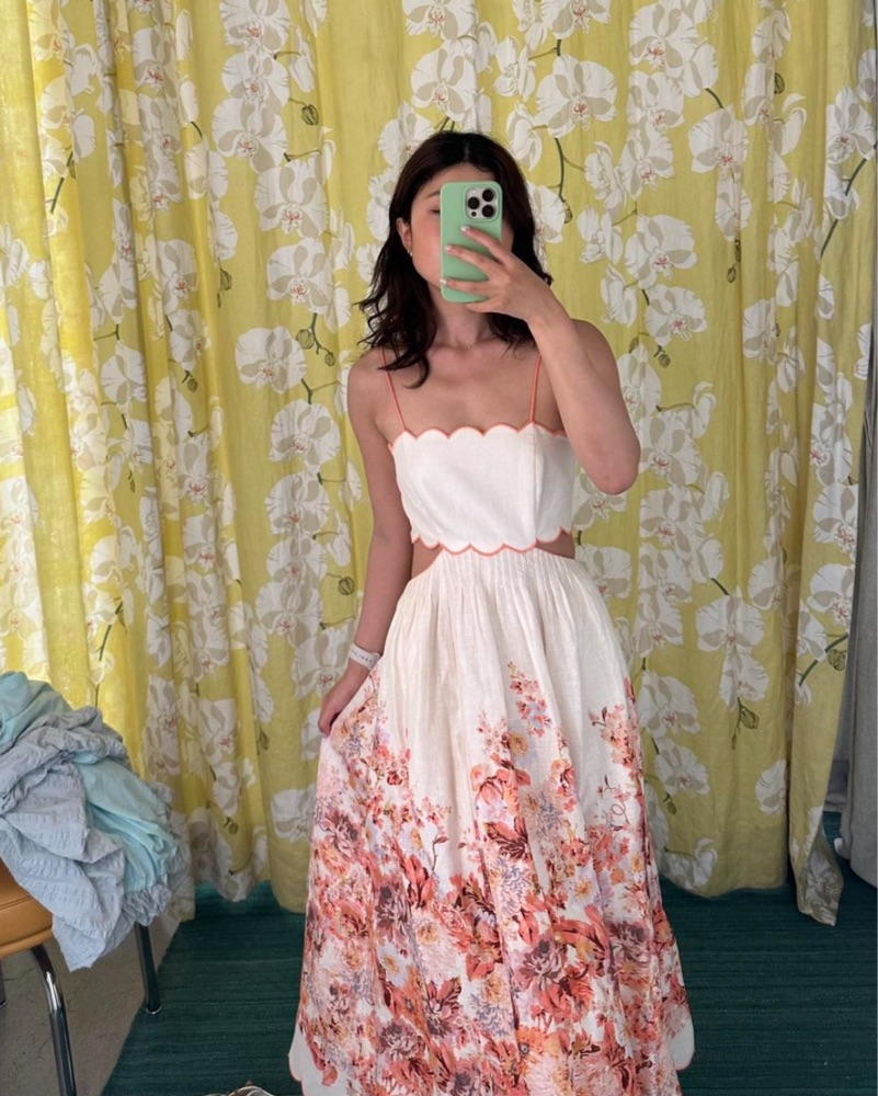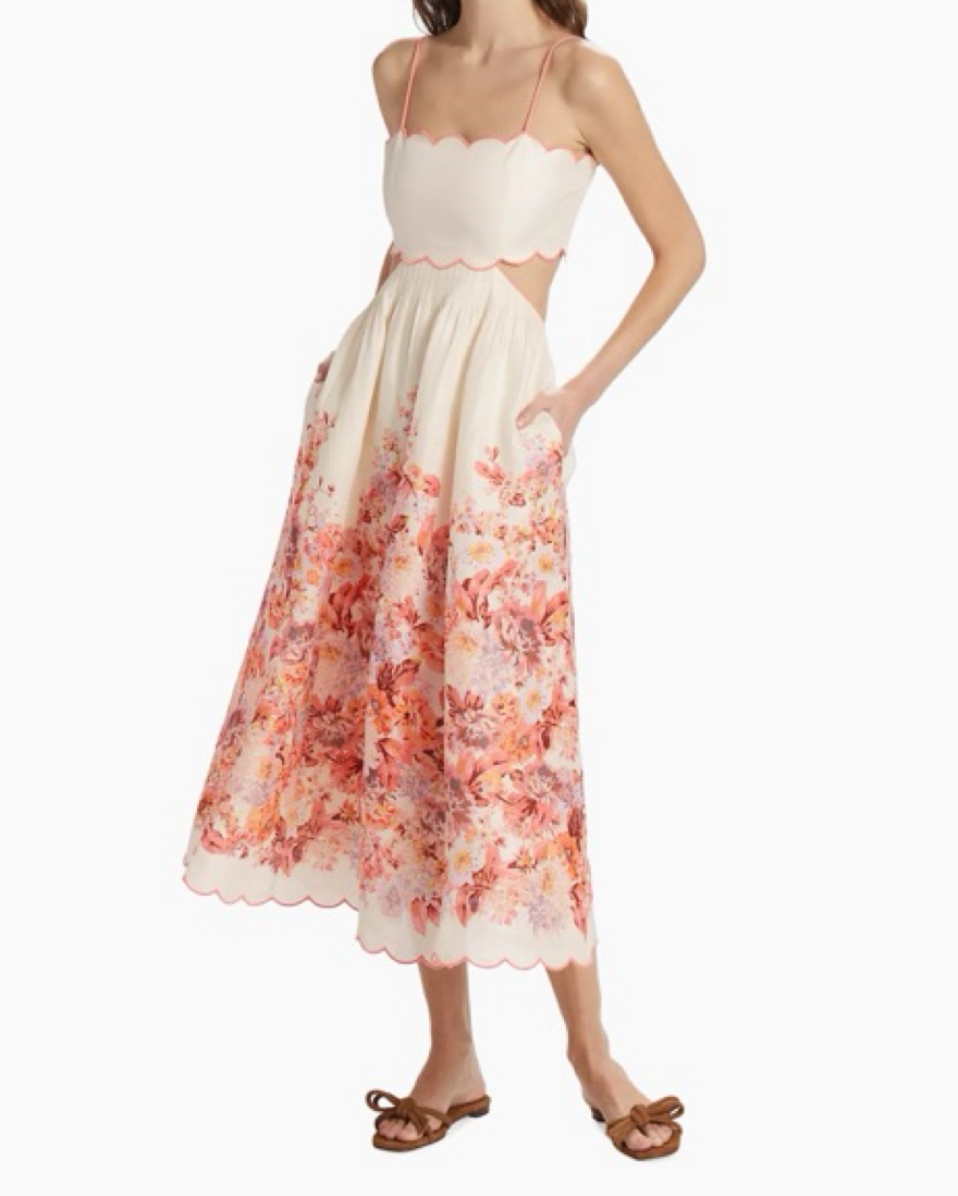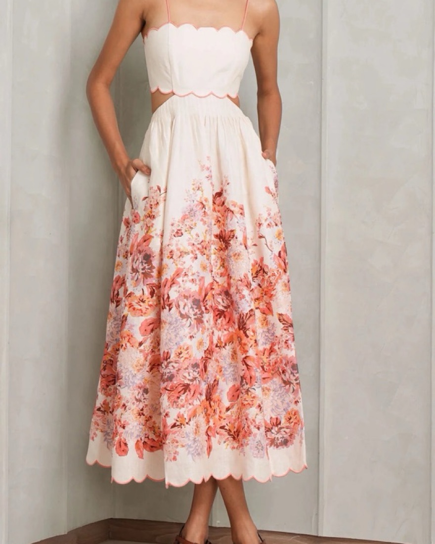 Stunning Zimmermann scallop midi linen dress features a beautiful floral print that is perfect for a garden party or outdoor wedding. Same dress worn by Taylor Swift but in red!