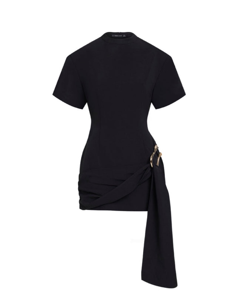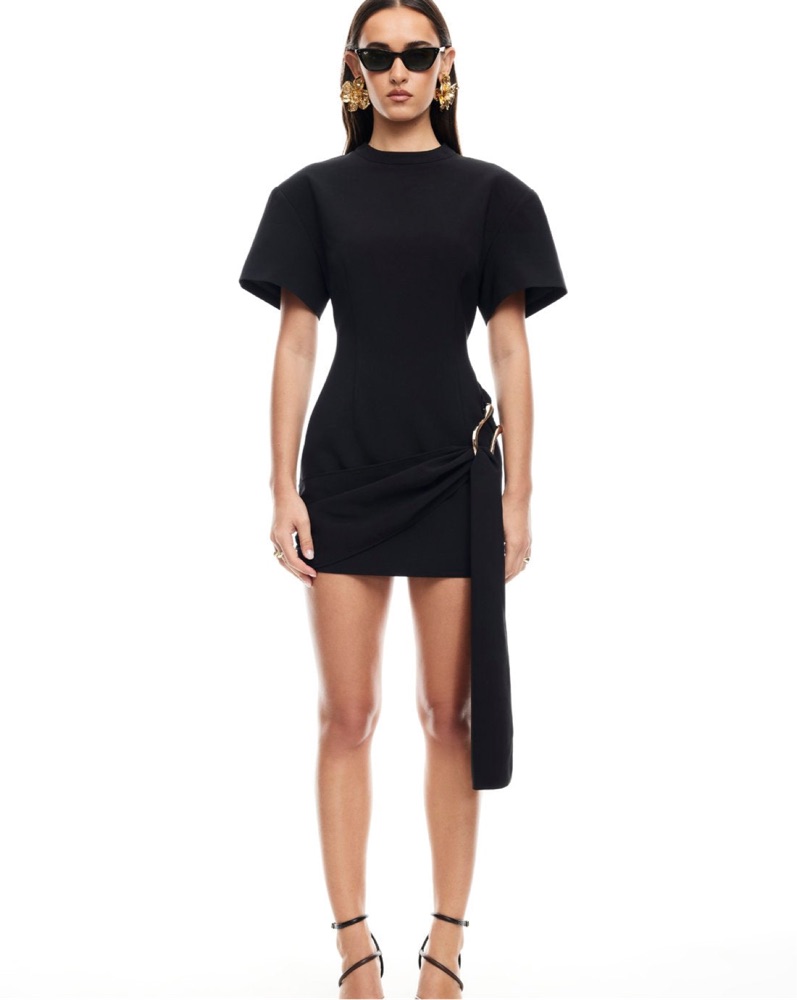 Structured tshirt mini dress w draped belt detailing. Oversized sleeves & shoulder pads. Super flattering - cinches at waist