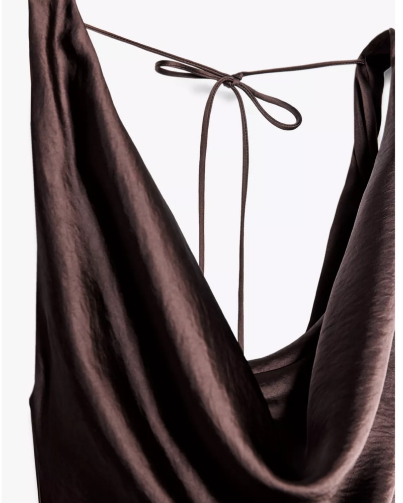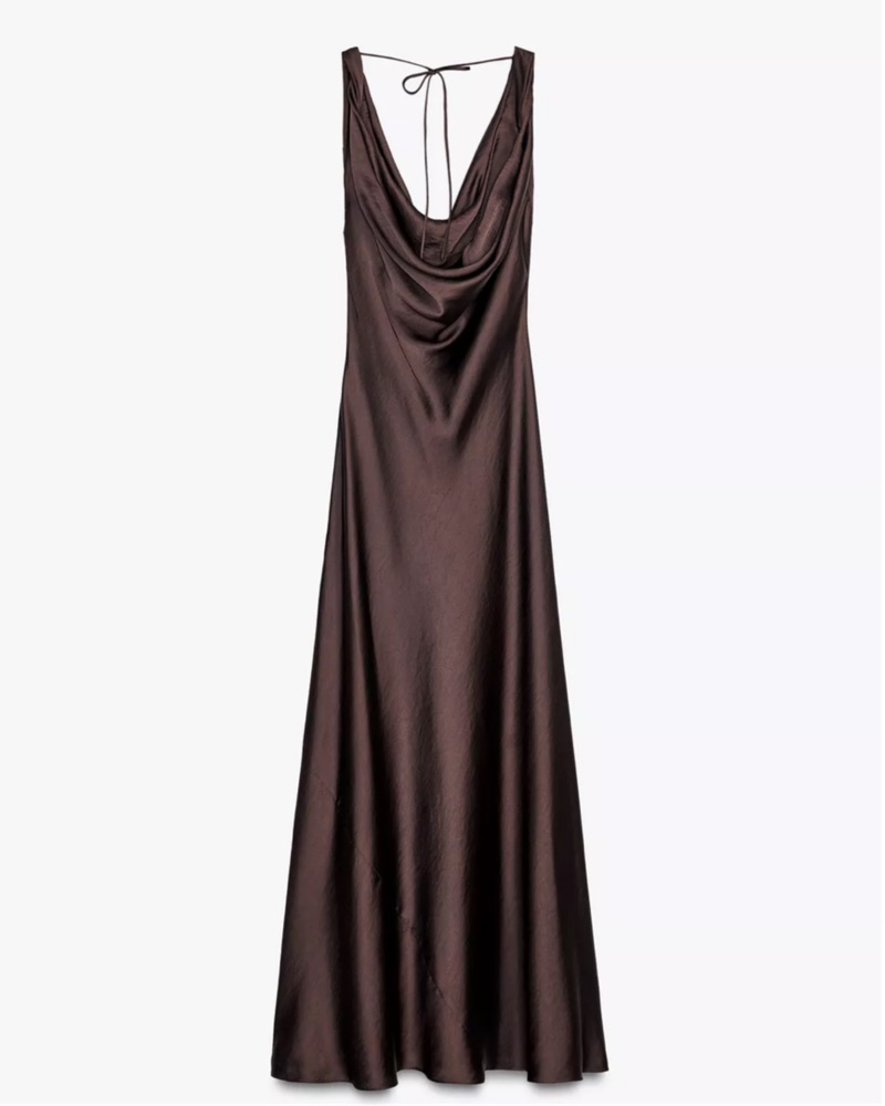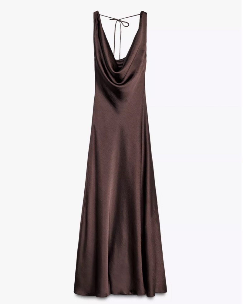 This luxurious satin gown is perfect for a formal event or special occasion. The draped halter neckline and flowing silhouette create a sophisticated look.