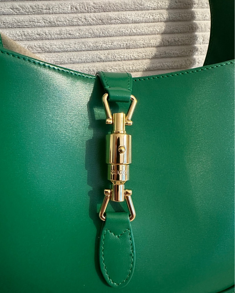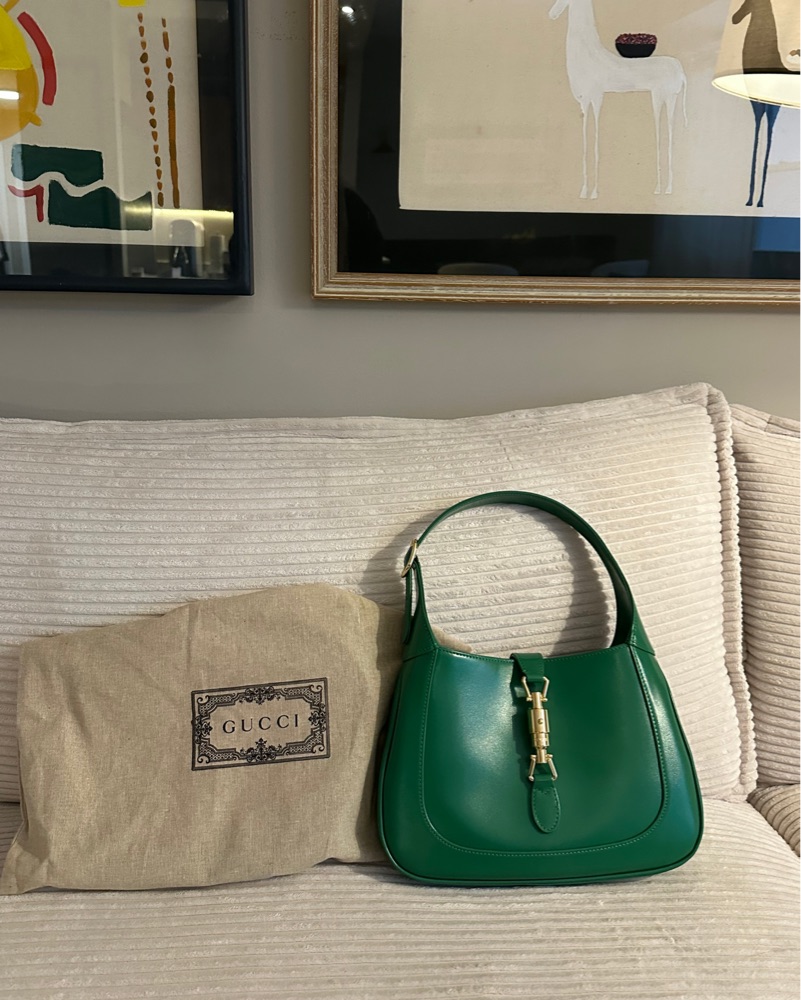 This vibrant green Gucci handbag is the perfect accessory to elevate any outfit. Its structured silhouette and chic gold hardware make it a timeless statement piece.
