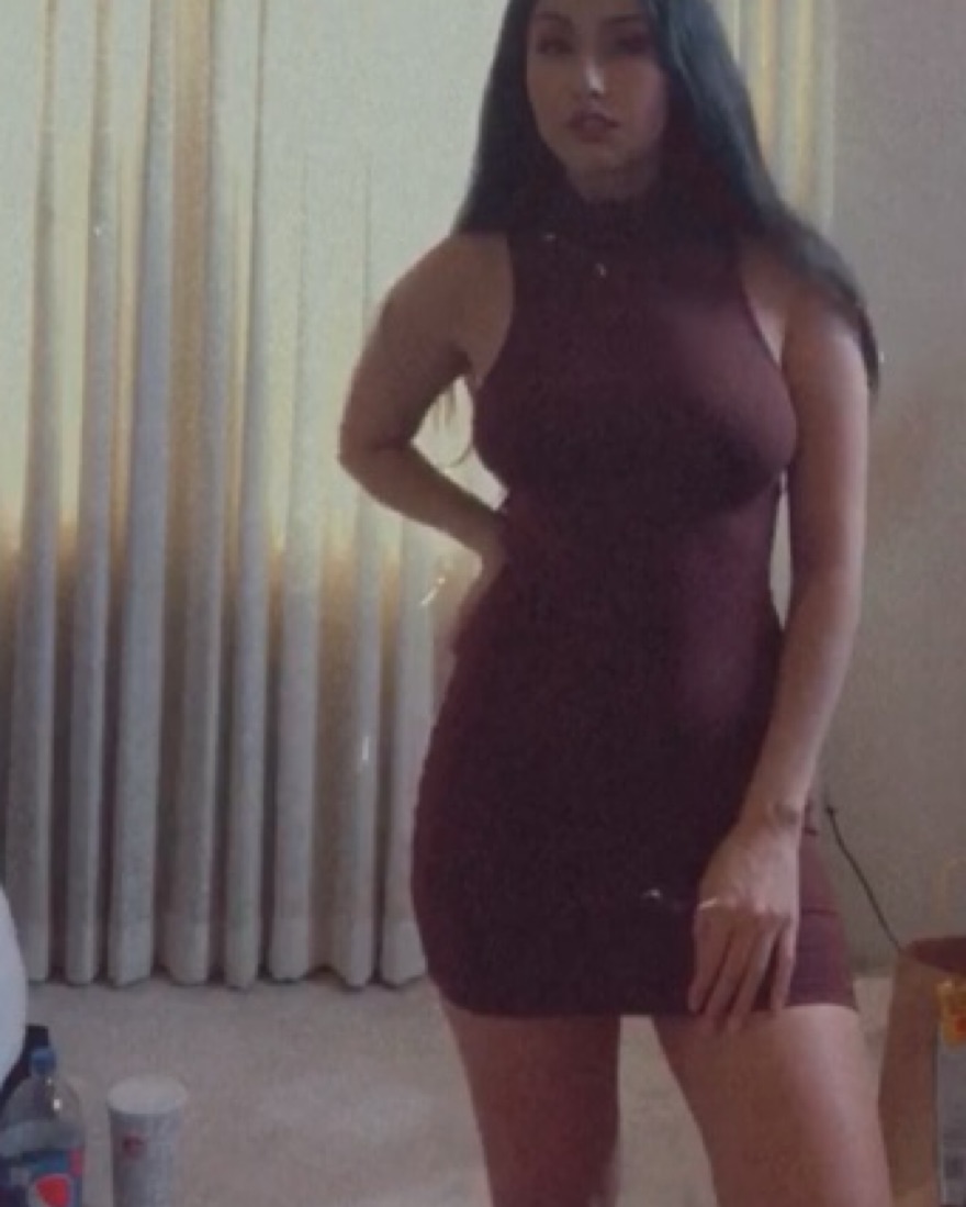The material is ribbed and light but no see through. It has a turtle neck and mini length