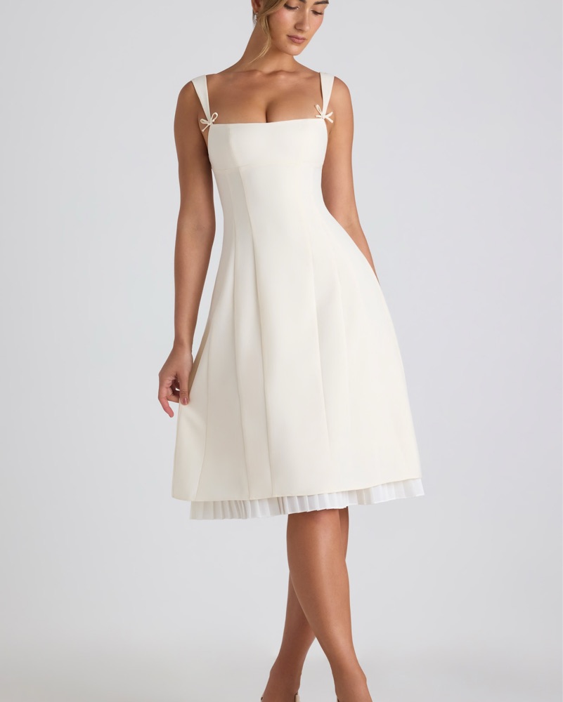 This elegant ivory midi dress is perfect for a special occasion. The flattering A-line silhouette and subtle bow details create a chic, feminine look.