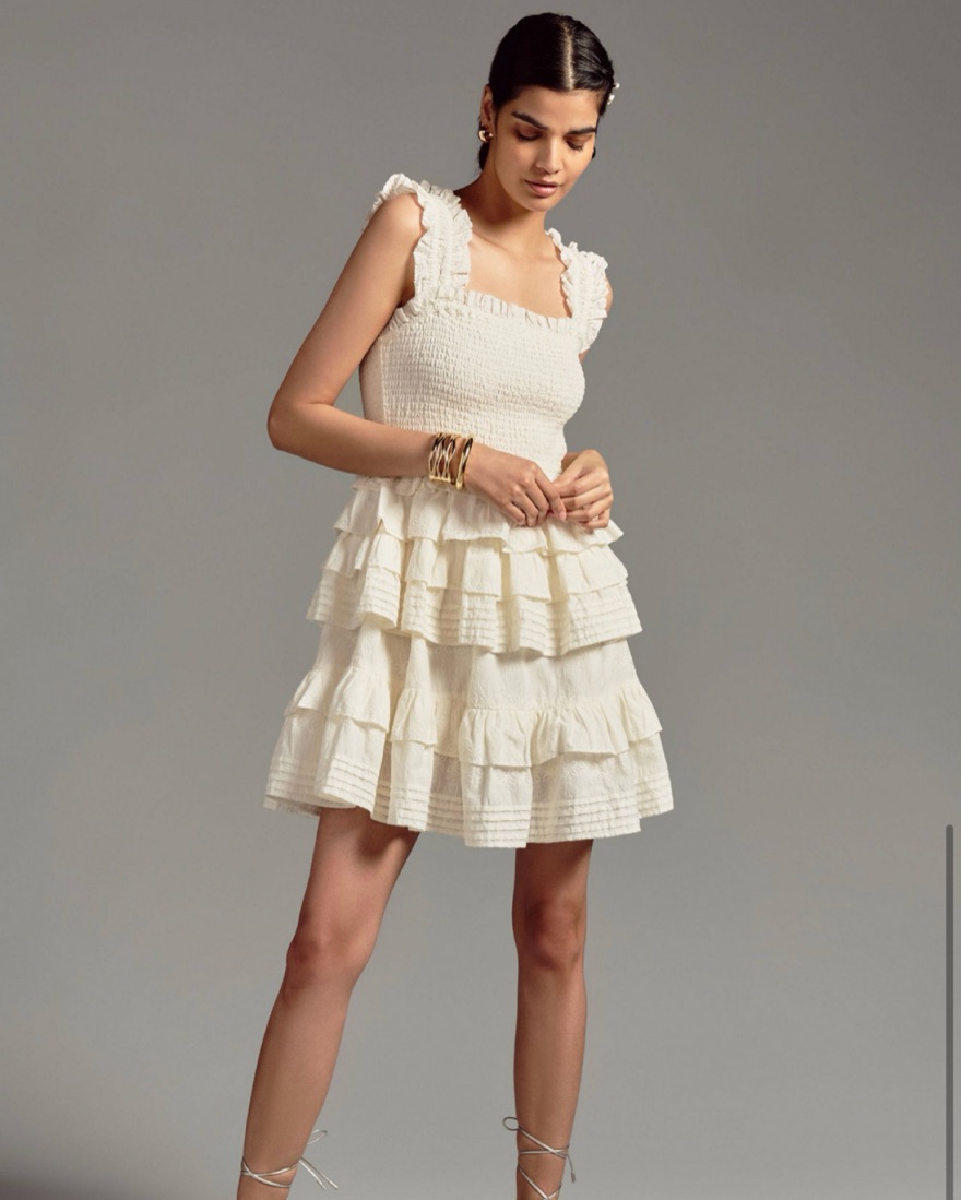 Cream Leona Mini/Midi Dress with elastic smocking, pin tucked ruffle layers and ruffled tiers. Very comfortable and thick material. So flattering and fun! Perfect for vacations and dinner parties.