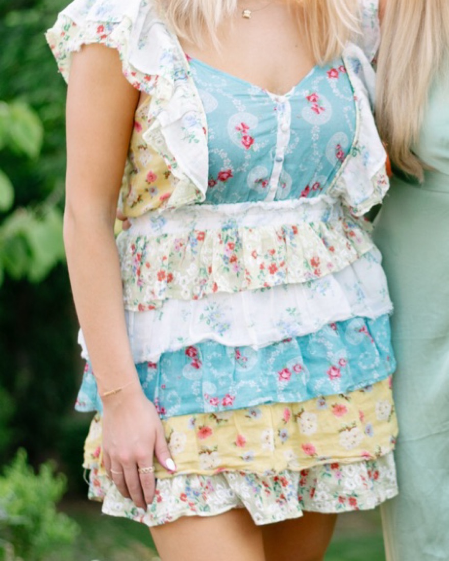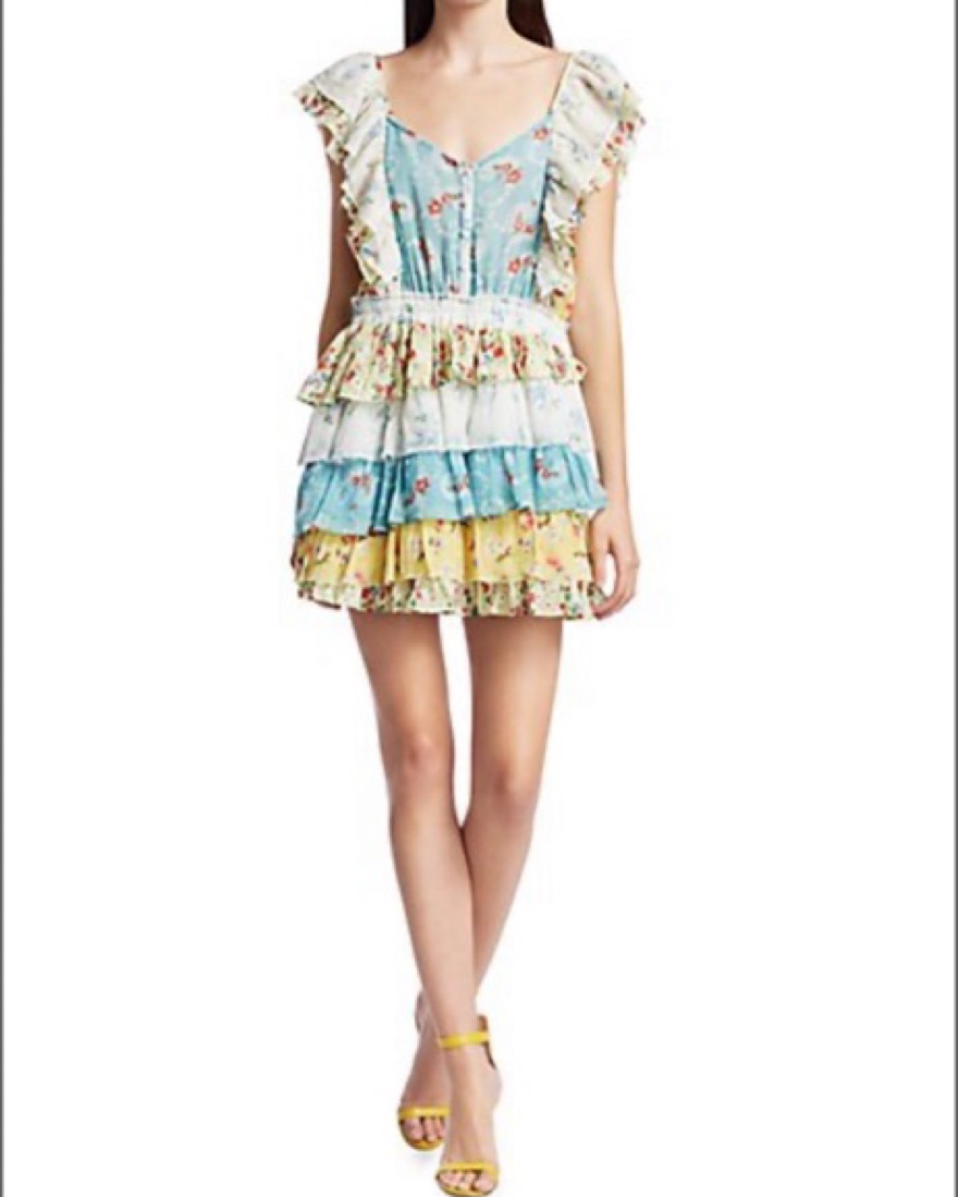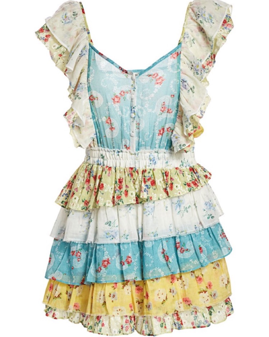 LoveShackFancy Phyllis Multiprint Ruffle Dress! Details: V-neck Short ruffle sleeves Pullover style Button front detail Elastic waistband Cotton