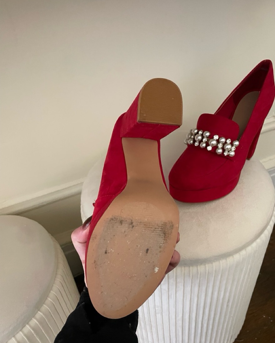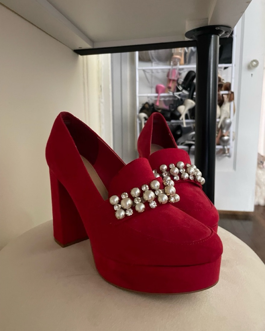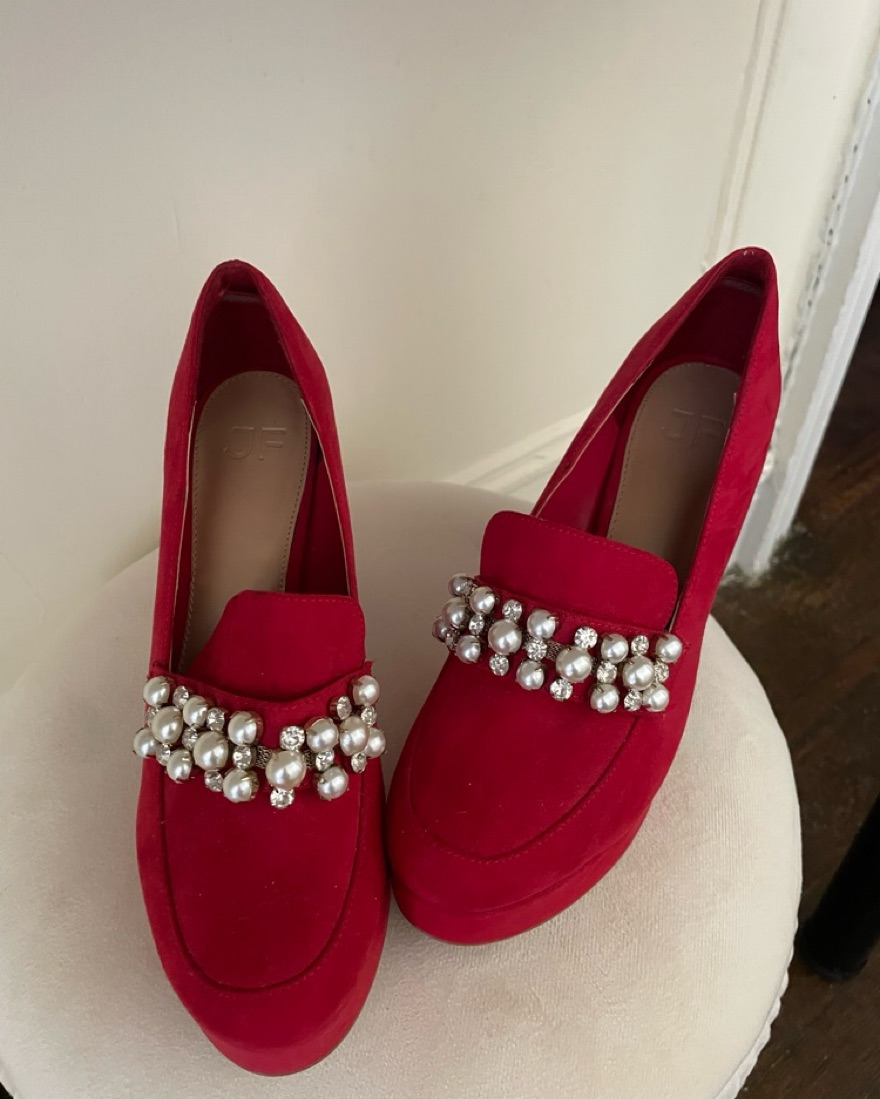 These stunning red velvet pumps feature a luxurious silky texture and an eye-catching pearl and rhinestone embellishment. Perfect for adding a touch of glamour to your next special occasion.