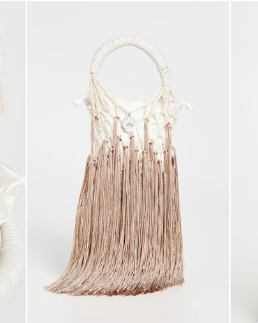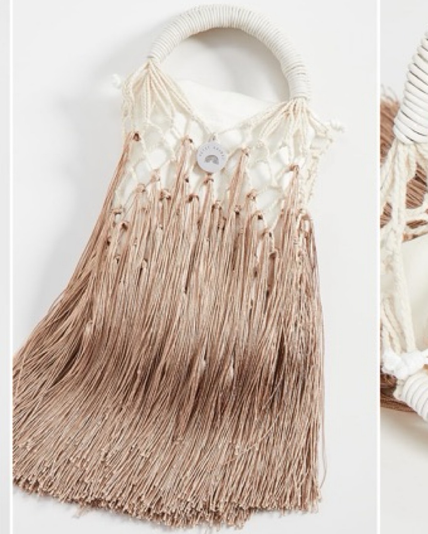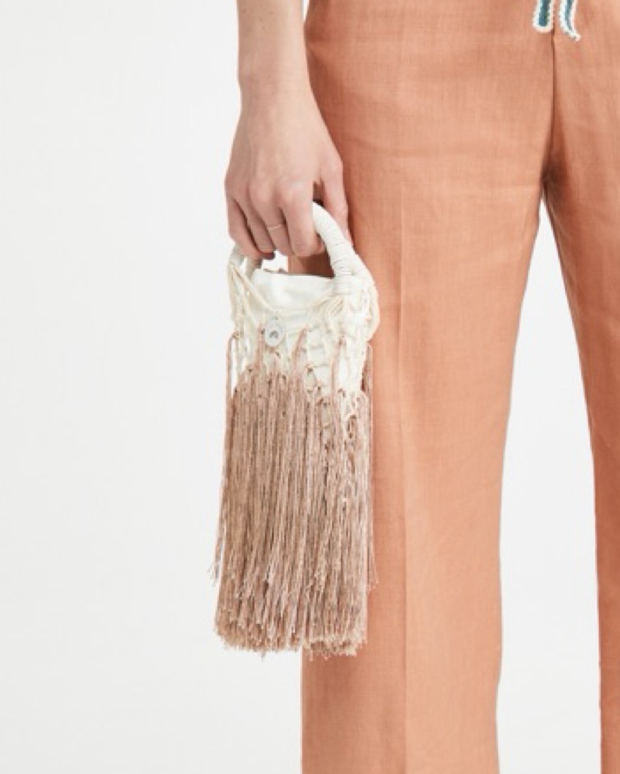Mini 100% cotton twist net bag with 100% ecru leather wrapped handle and ombré-nude fringe