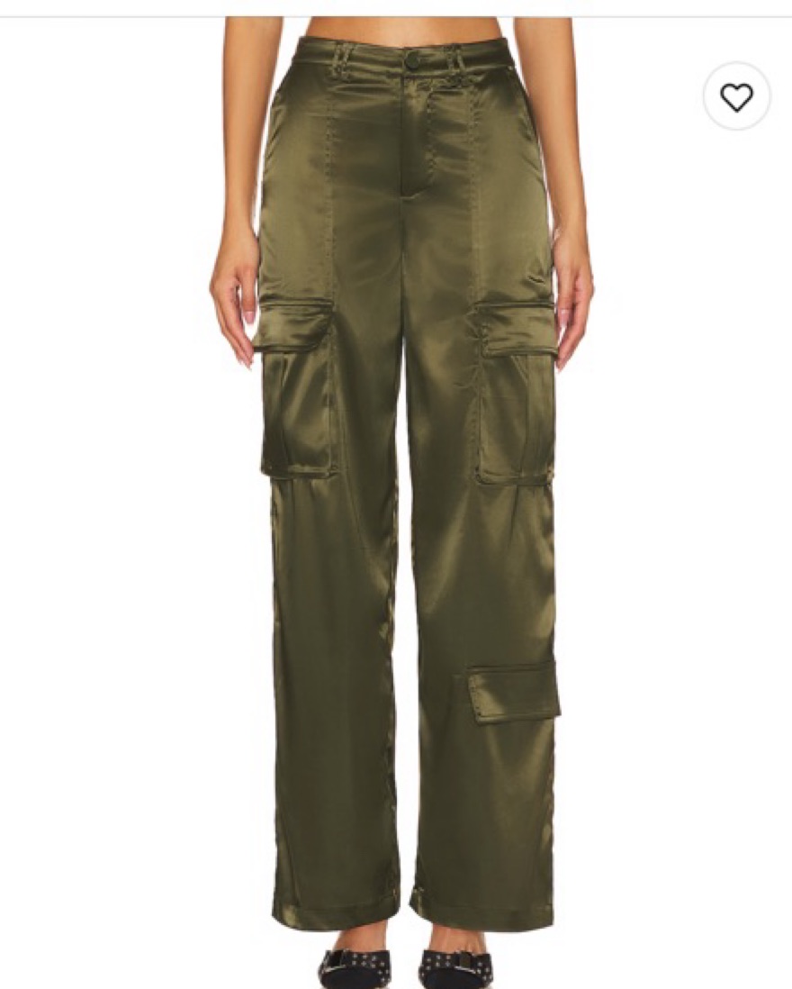 These chic olive green satin cargo pants offer a stylish and versatile option for any occasion. The high-waisted silhouette and cargo pockets add a utilitarian touch that can be dressed up or down. Revolve X Remi collab.