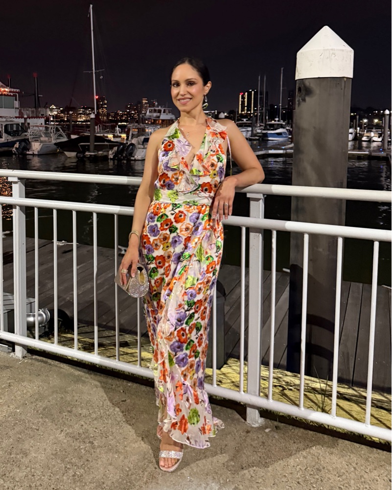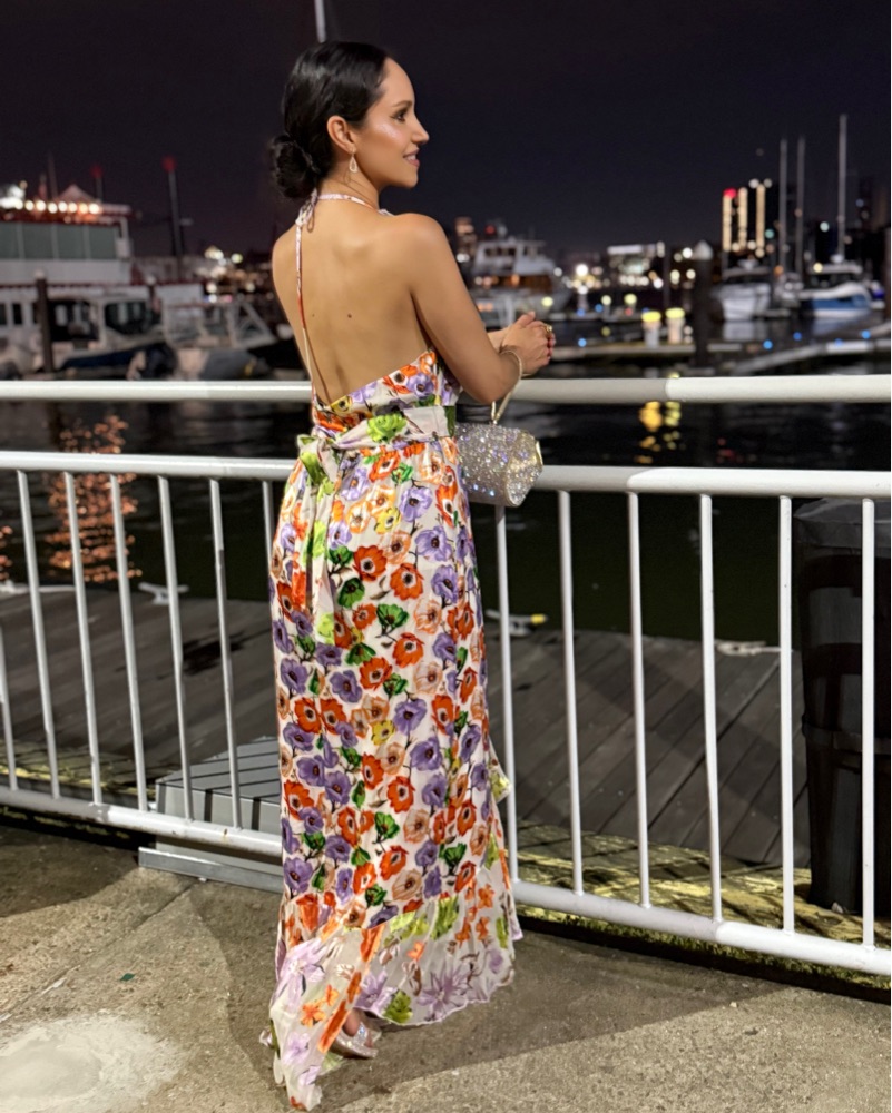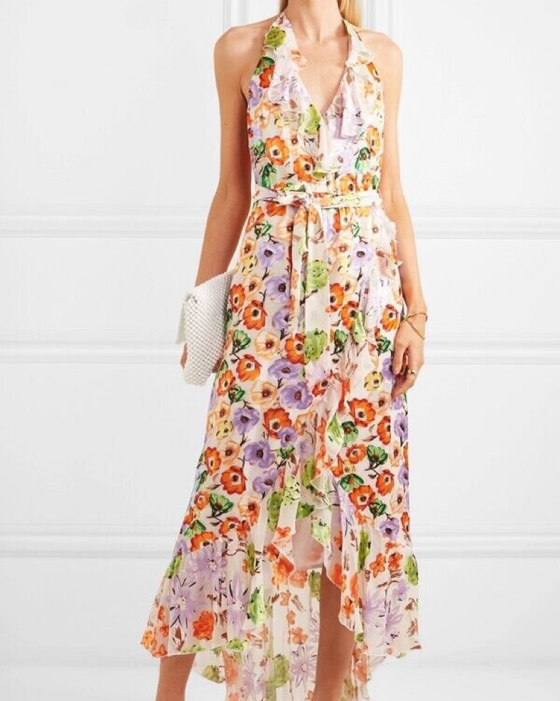 This dress is gorgeous, flattering and very comfortable. New condition. Ruffles at the neck and asymmetrical flounce hem give this maxi dress a feminine, yet playful, look.