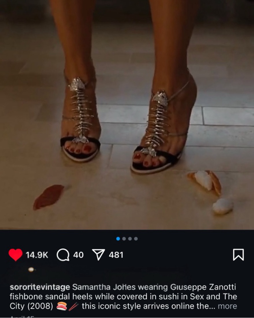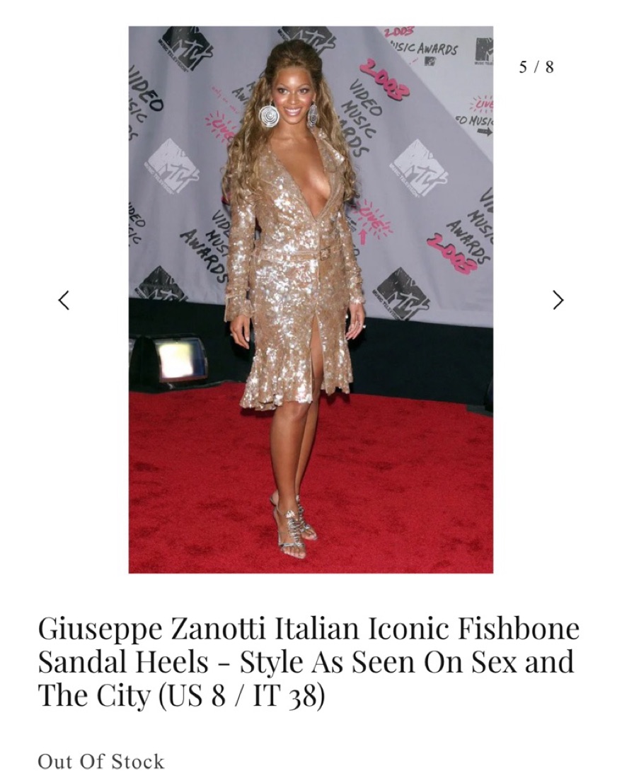 Sourced from Sororité Vintage. This iconic style can be seen on Samantha Jones in Sex and The City (2008), and on Beyoncé at the 2003 VMA’s. IT 38, about 2.5 inch heel; soles worn but fish in perfect condition