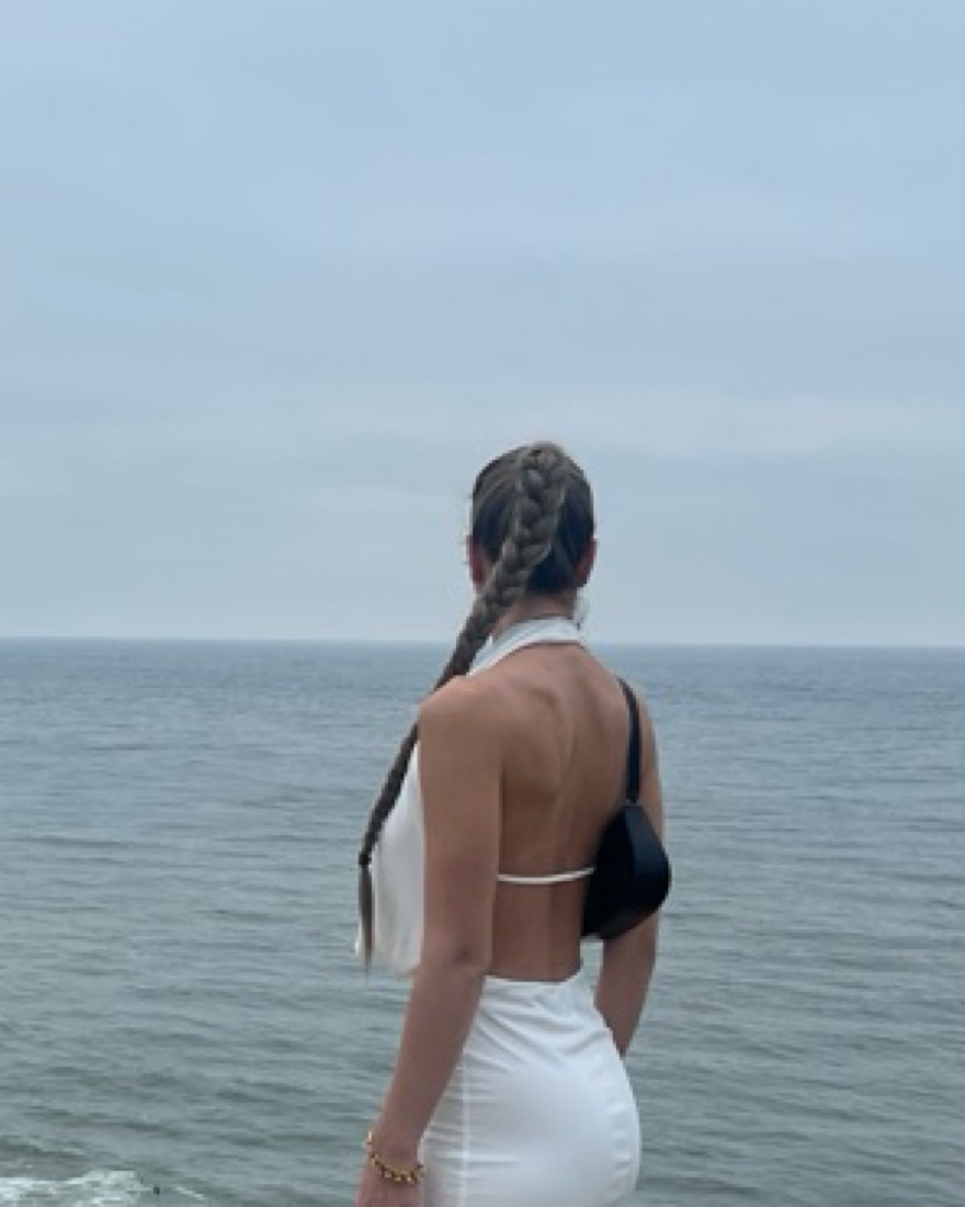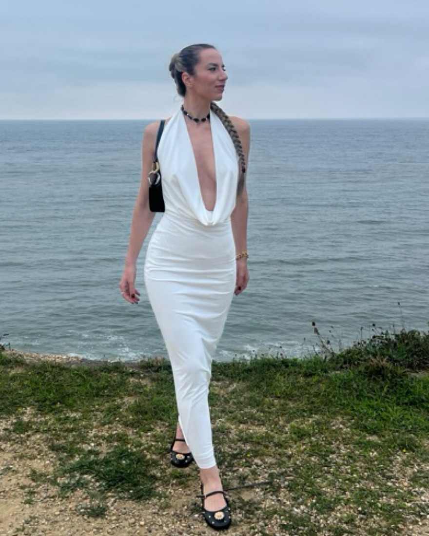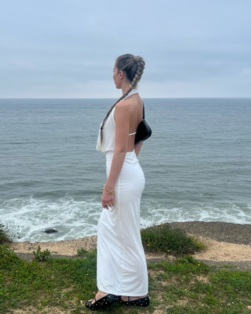 Features a deep v neck with a relaxed yet chic tone. Hugs around the hips and adjustable strap for the back. Pair with heels or flats as shown in photos. Perfect for the Hamptons! Available in black also!