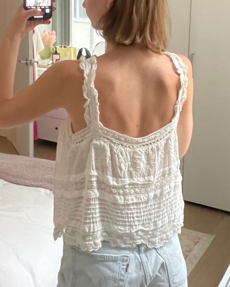 This beautiful tank top features intricate crochet lace detailing for a feminine, boho-chic look. Pair it with denim shorts or skirts for a relaxed, summery style.