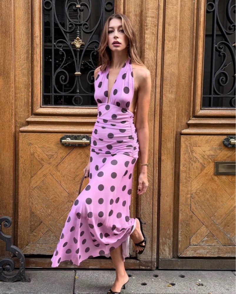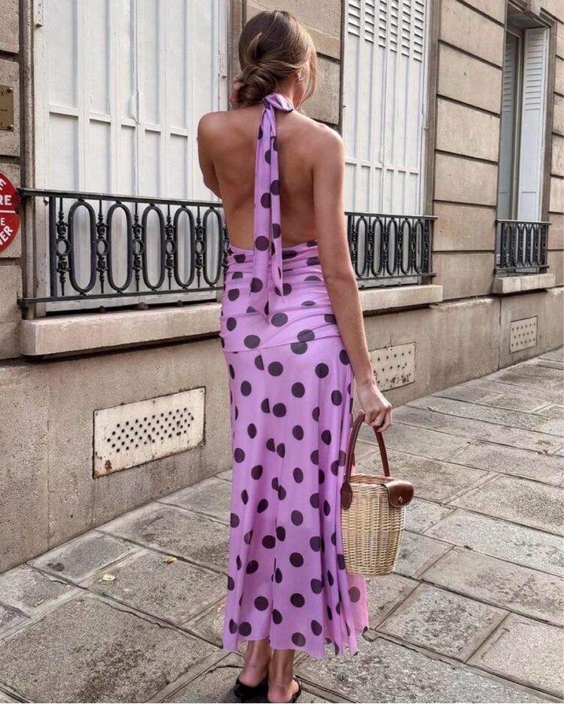 This vibrant polka dot dress is perfect for a summer event or romantic date night. The halter neckline and ruched waist create a flattering silhouette.