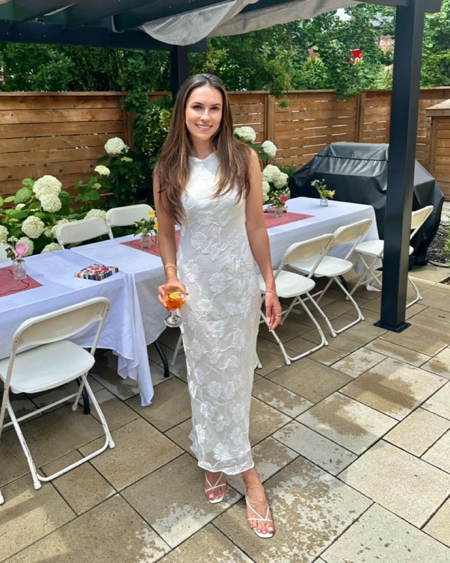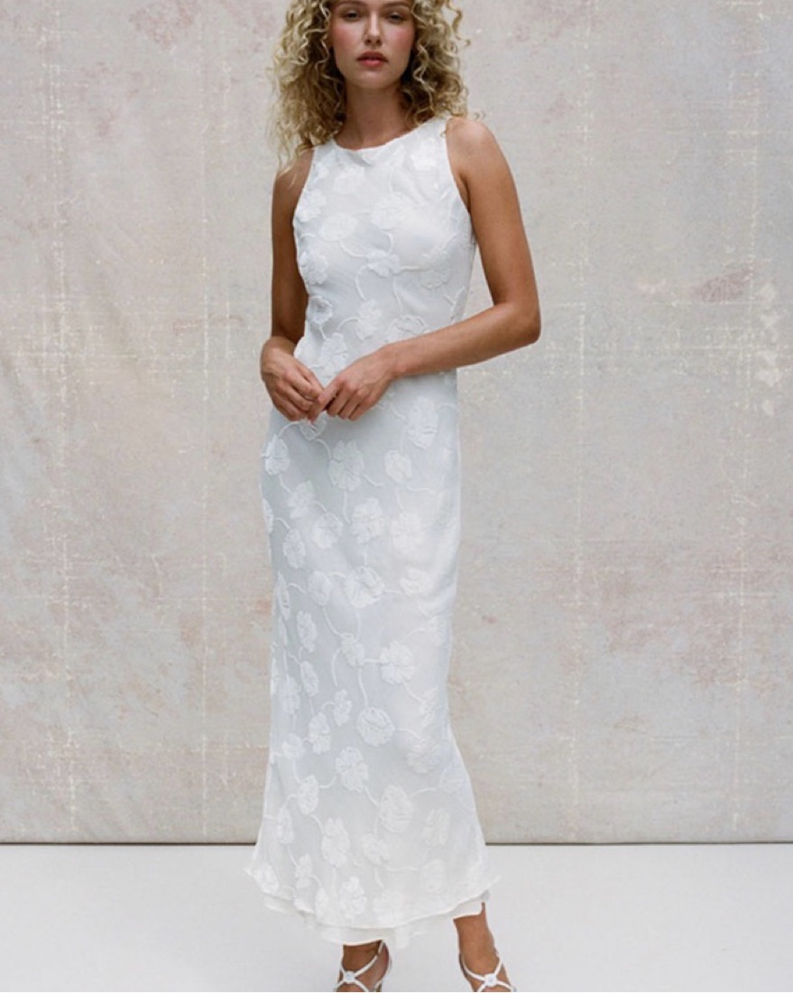 This stunning white maxi dress features a beautiful floral pattern and a flowing silhouette, perfect for a summer wedding, bachelorette, bridal shower or special occasion.