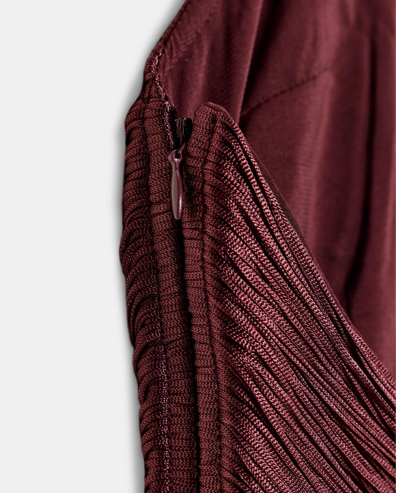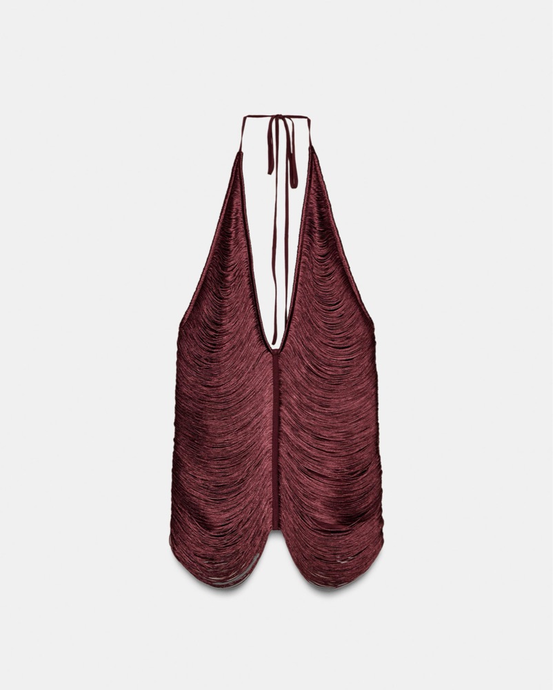 Halter top with a V-neckline. Open shoulders. Fringe appliqué detail. Side hidden in-seam zip closure. PLUM | 4772/178/647 New Fall/Winter collection