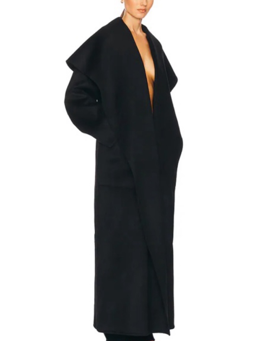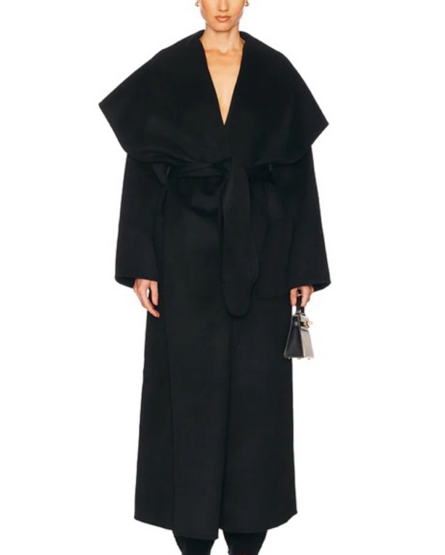 This striking black wool coat features a dramatic, oversized collared wrap design for a bold, modern look. Ideal for elevating any outfit. Perfect condition. Size M.