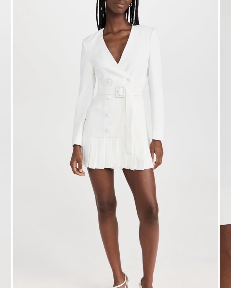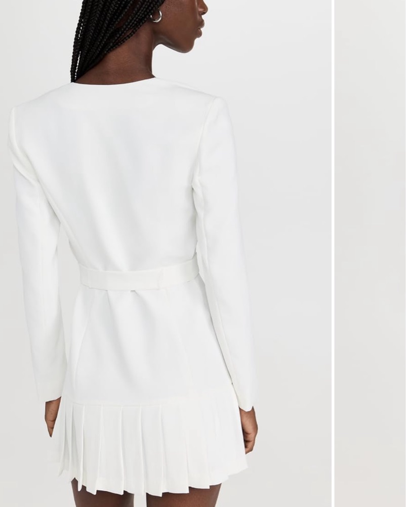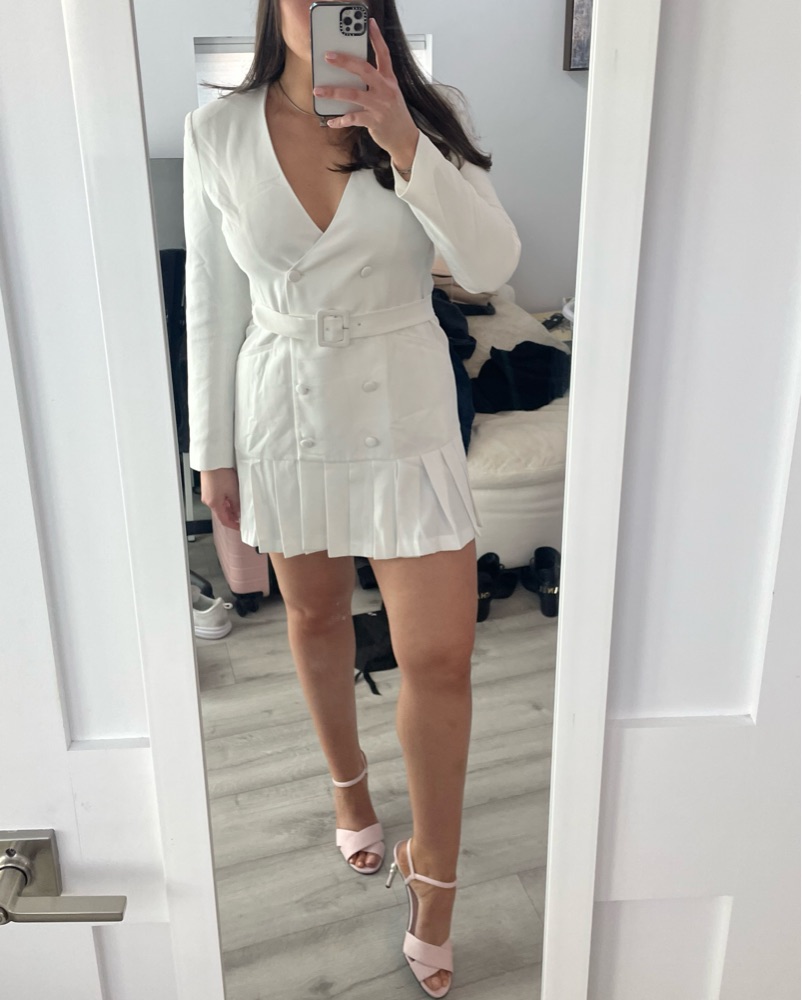 White blazer style dress, runs on the smaller side. Fits like a size 8