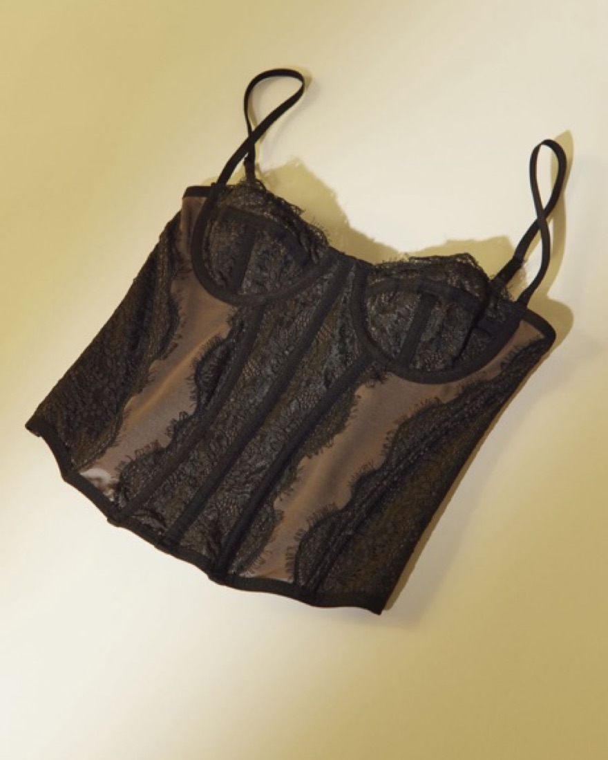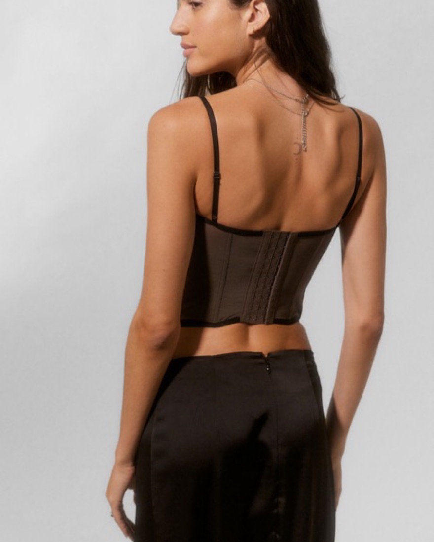 Viral UO corset in black! Runs small—i’m usually a Small but my cup size (in between B and C) and waist fit best in Medium!