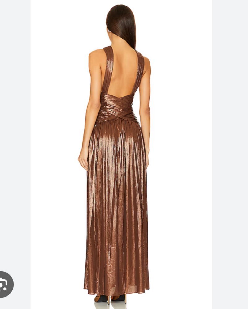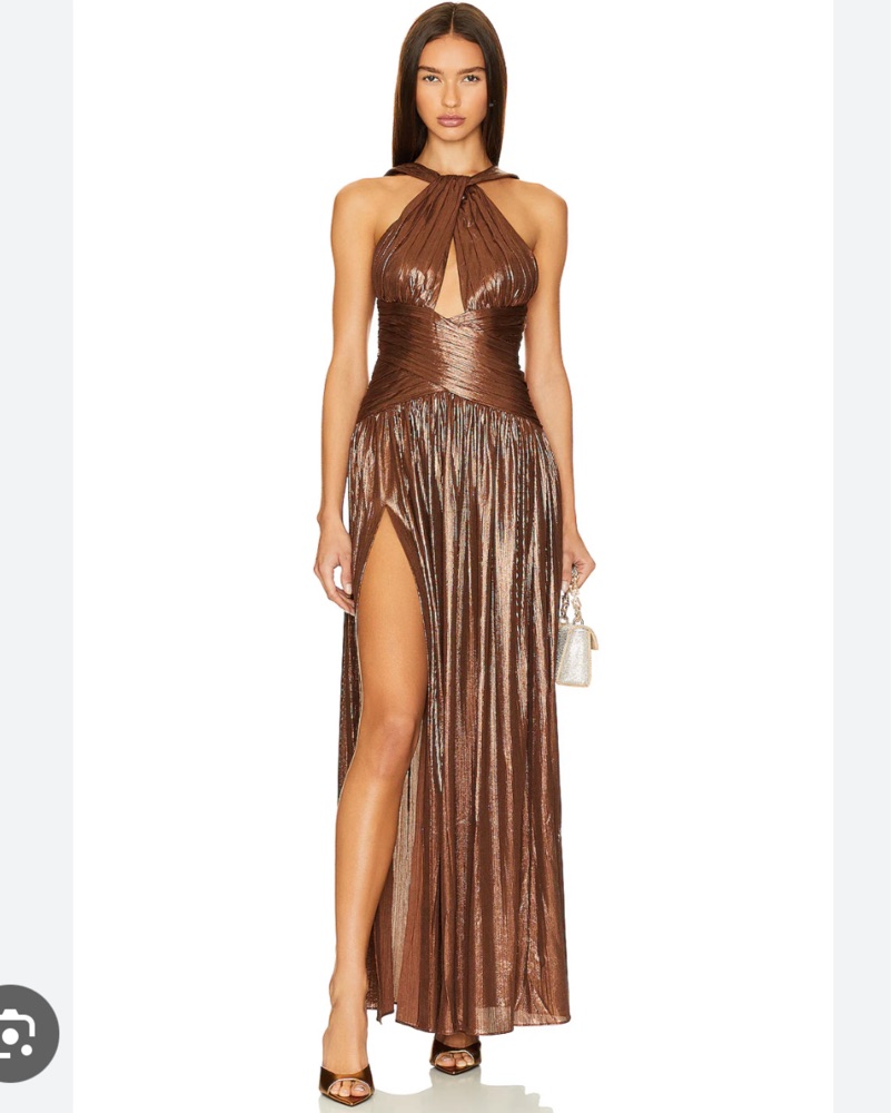 This stunning metallic halter dress is perfect for a glamorous evening event. The high slit and figure-flattering silhouette create a bold, show-stopping look. This was hemmed to approx 5’6”-5’8” height (accounting for heels) wedding guest gown metallic bronze