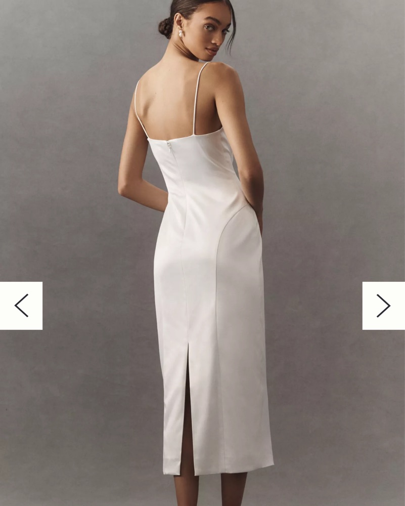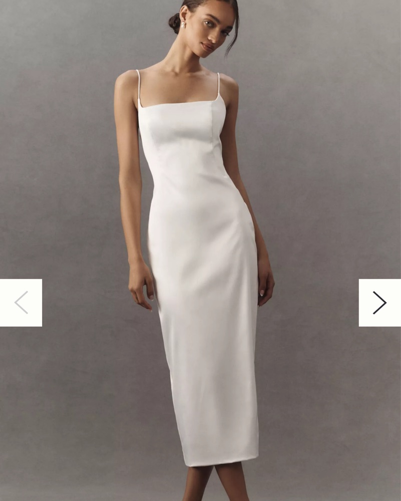 The BHLDN Square-Neck Back-Slit Slim Satin Midi Dress offers a sleek, elegant silhouette with a flattering square neckline and a chic back slit, crafted from luxurious satin for a refined look.