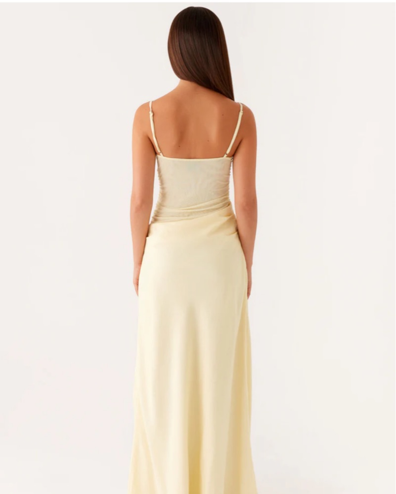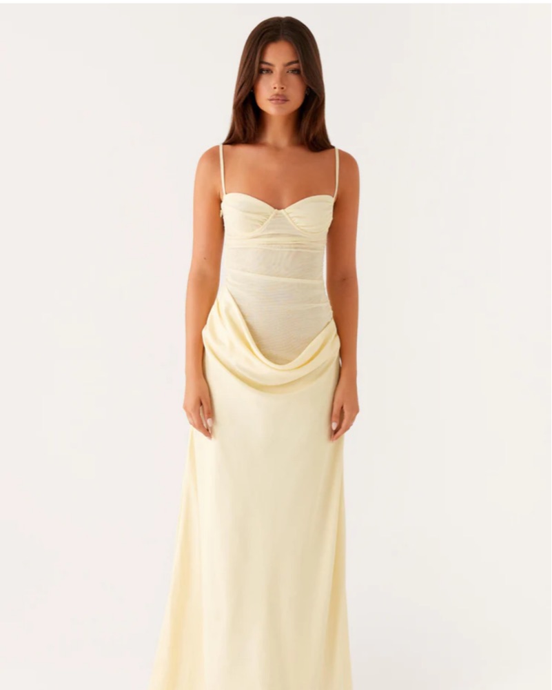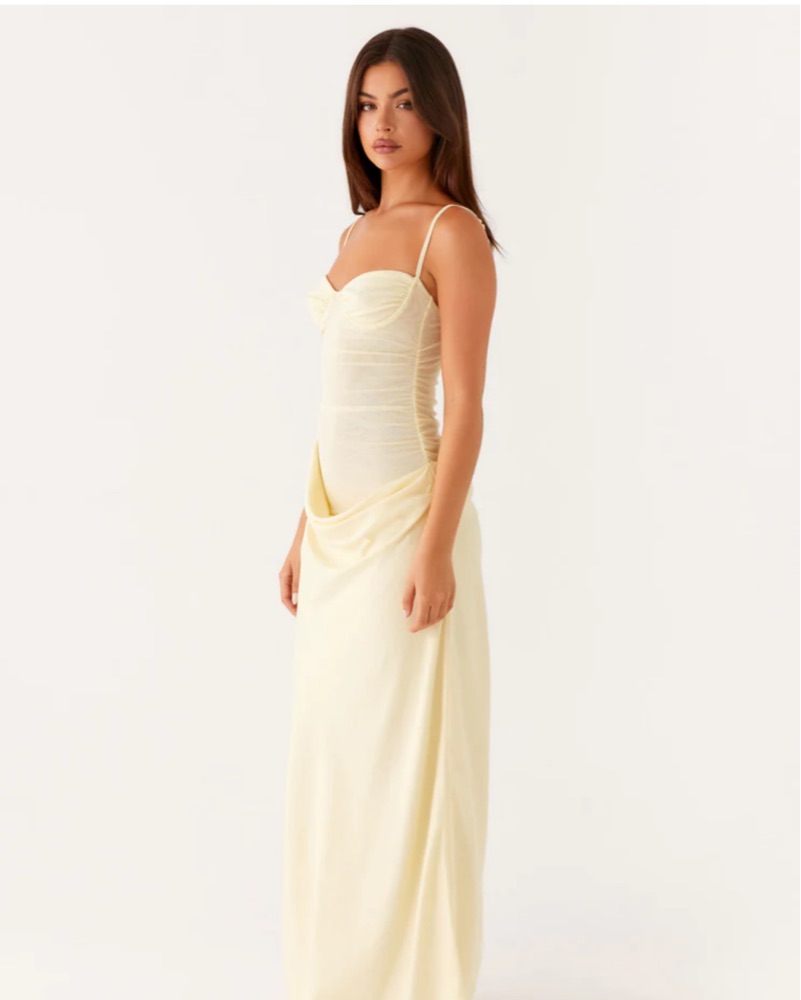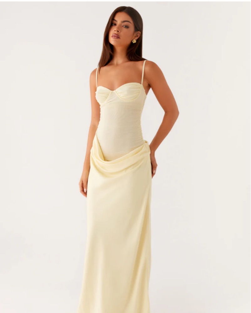 The Romy Maxi Dress is a stunning and structured piece, featuring underwired support for a flattering fit and gathered skirt detailing that adds texture and movement.