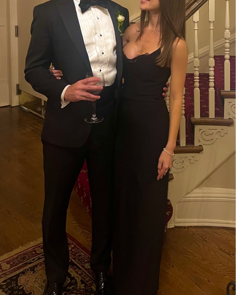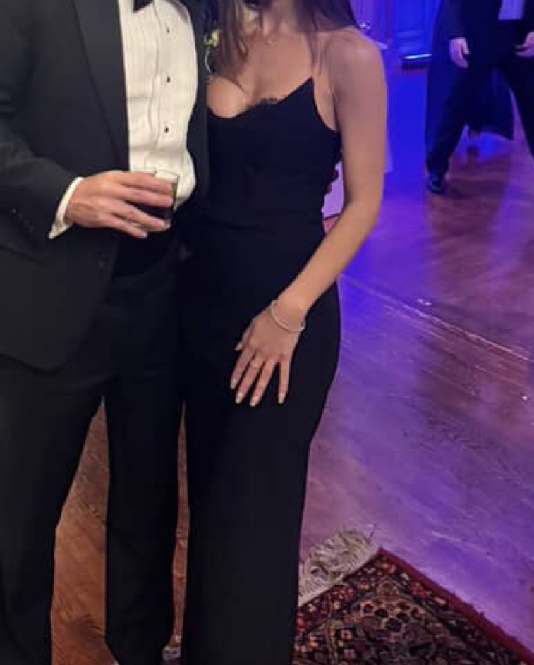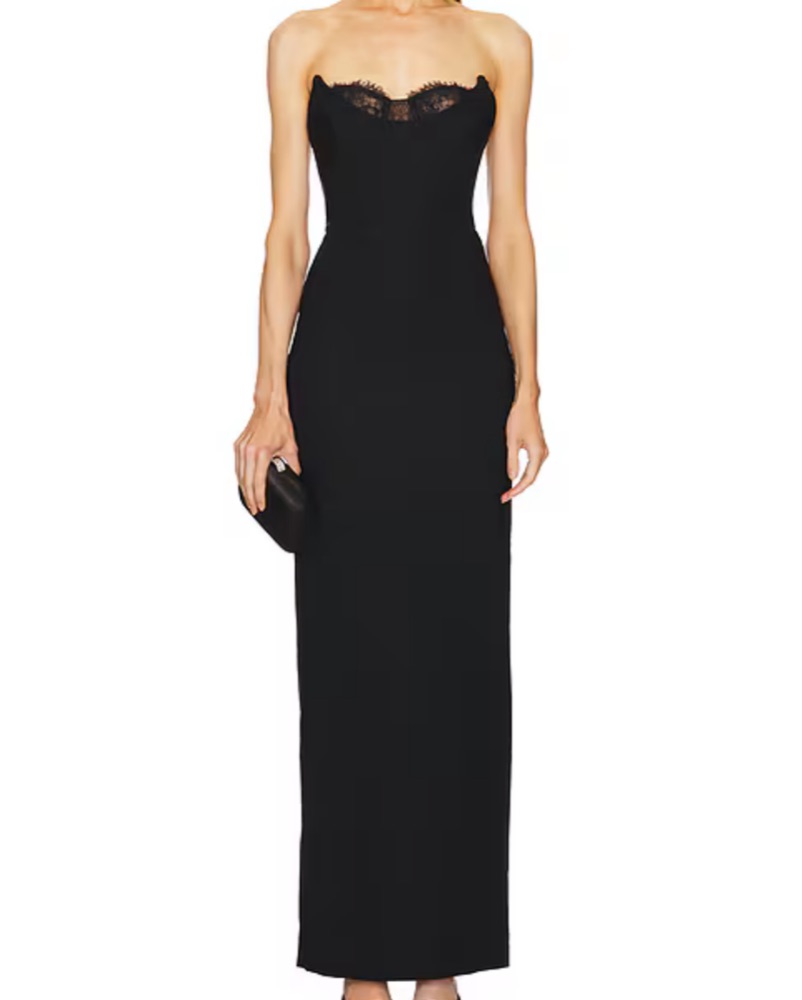 Strapless, lace bustier black tie gown - size XS! This is unaltered. I’m 5’4 34D and it was tight in the bust but still worked! Worn with 4 inch heels and it was a few inches off the floor.