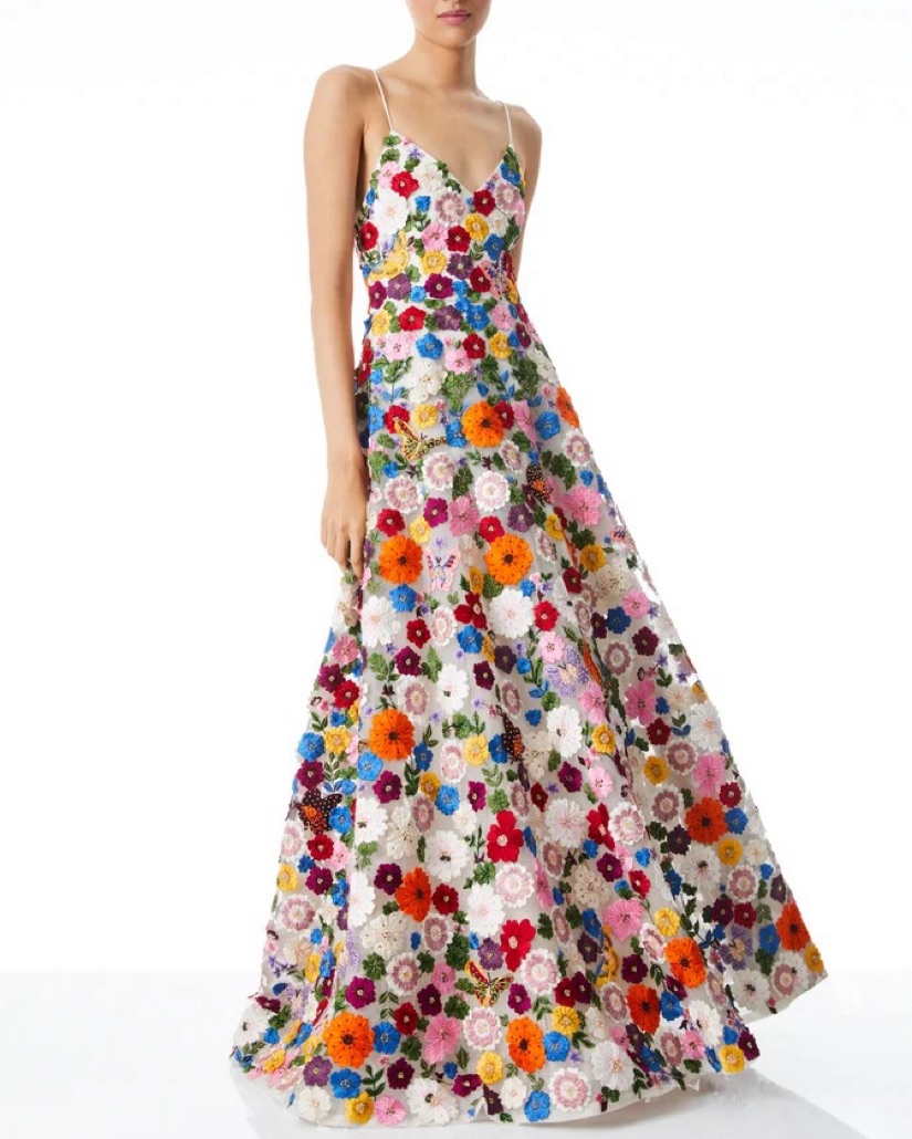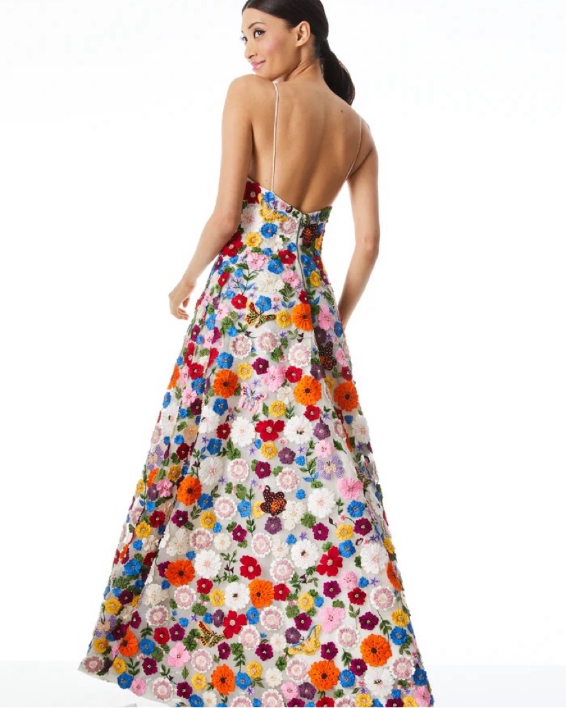 Renting my alice and olivia floral applique ballgown in a size 0 fits true to size, would fit a 00-0 called the DOMENICA EMBELLISHED BALL GOWN sold out online the perfect bridesmaids dress wedding guest dress or dress for your own wedding