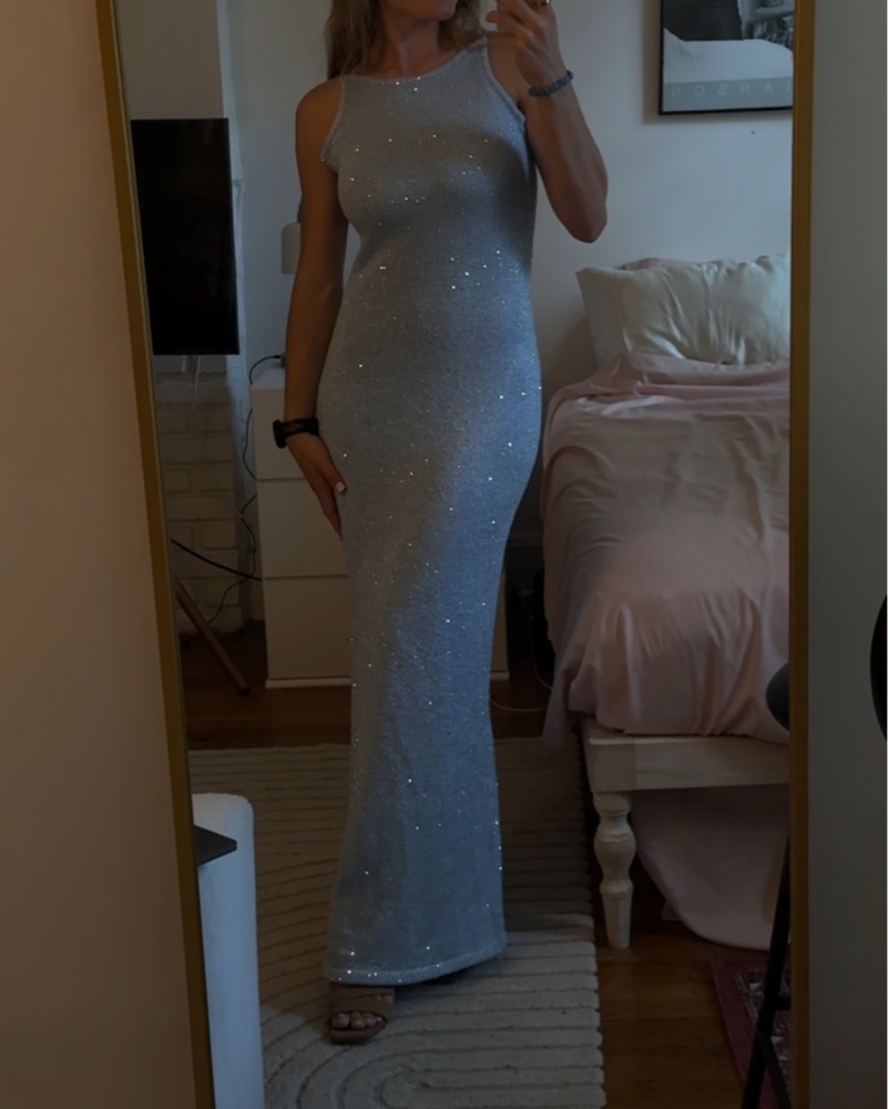 Slinky knit dress with micro sequins, side slit, scoop neck, low back, adjustable straps. Pulls on, moves with you, fully lined so it doesn’t cling. Heavier knit fabric, not sheer at all. I wore it to a beachy date night in Italy and it sparkled under city lights!