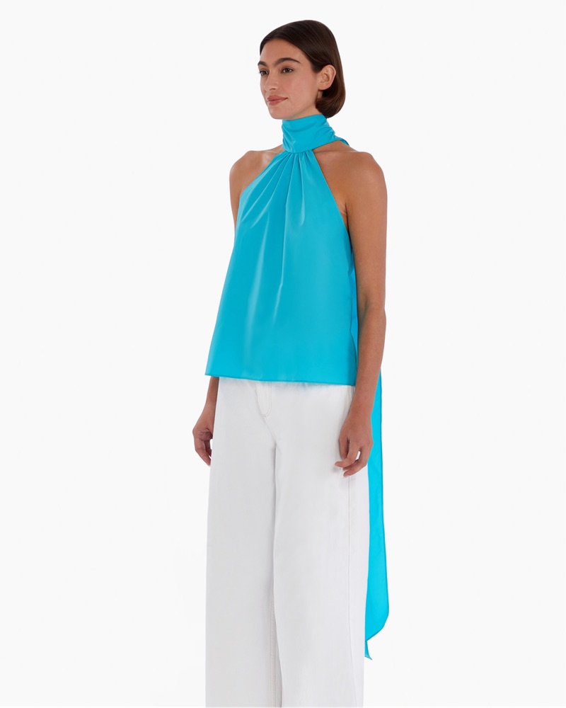 Elegant halter-style top featuring a mockneck with button loop closure and an attached neck self-tie drape. Crafted from midweight poplin fabric, offering a flattering silhouette.