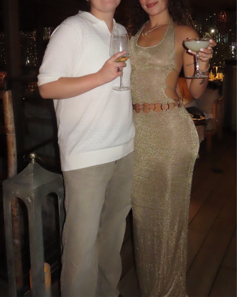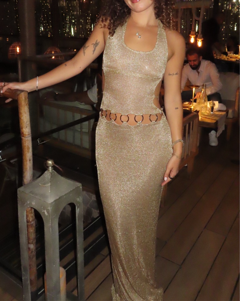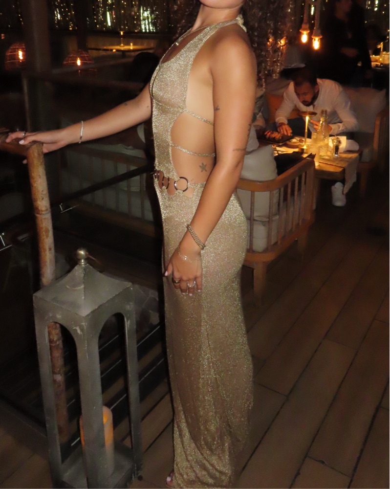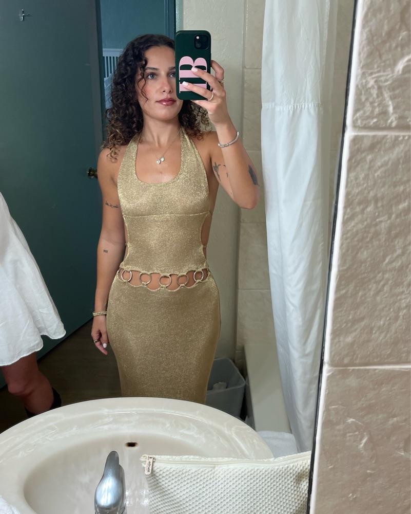 worn once for a birthday event, super flattering and cute, comes with a matching thong that isn’t really necessary to wear and is not included. carmen maxi dress in gold from outcast