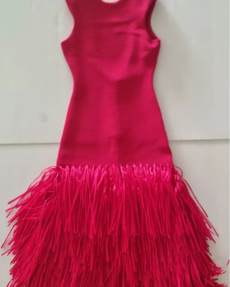 Make a bold statement with this stunning Aje dress and with a sleek fitted silhouette and a playful fringed hem. Perfect for vacation or wedding guest vibes! Has lots of stretch and could comfortably fit a size 8/10. I also have this available in a size small!