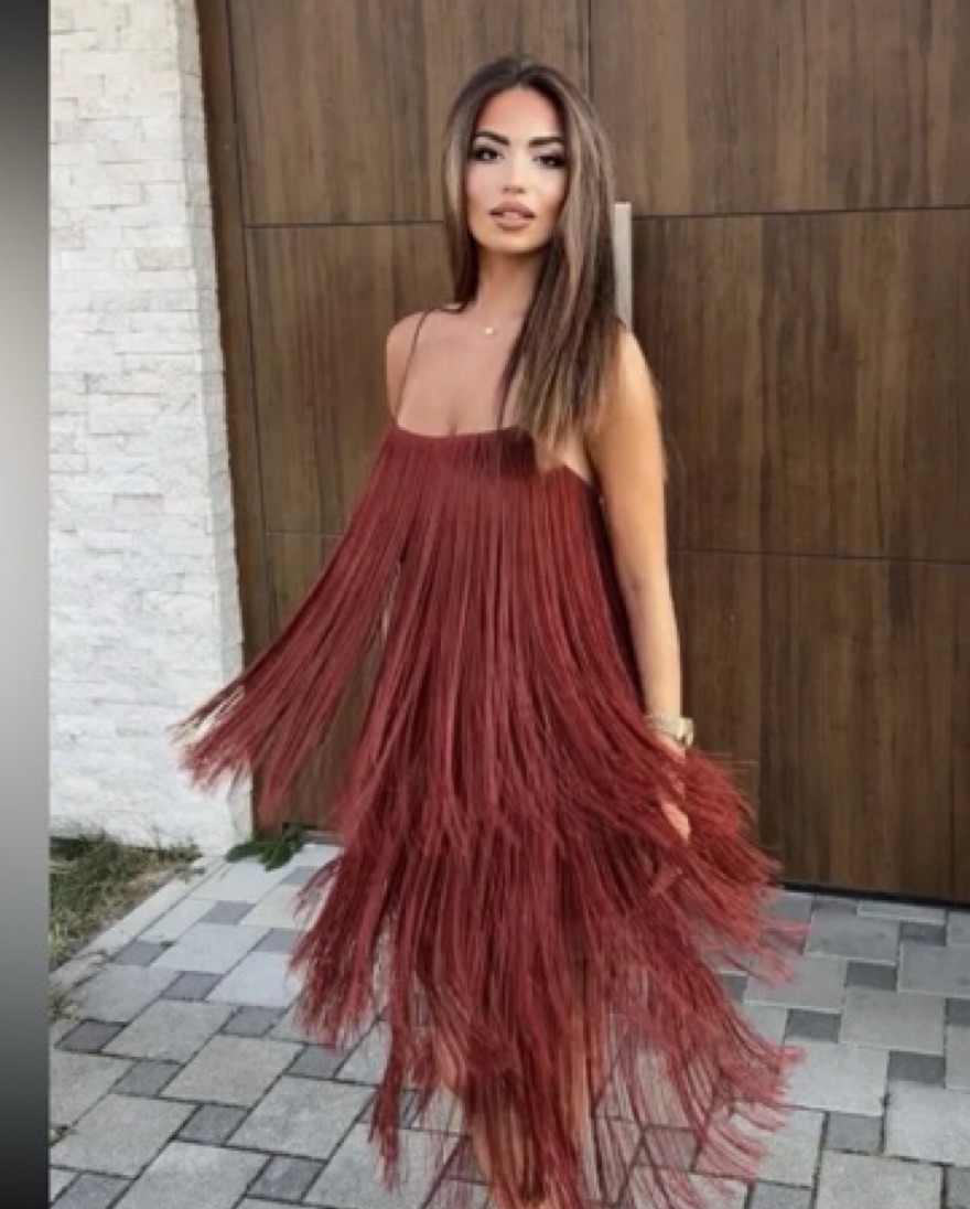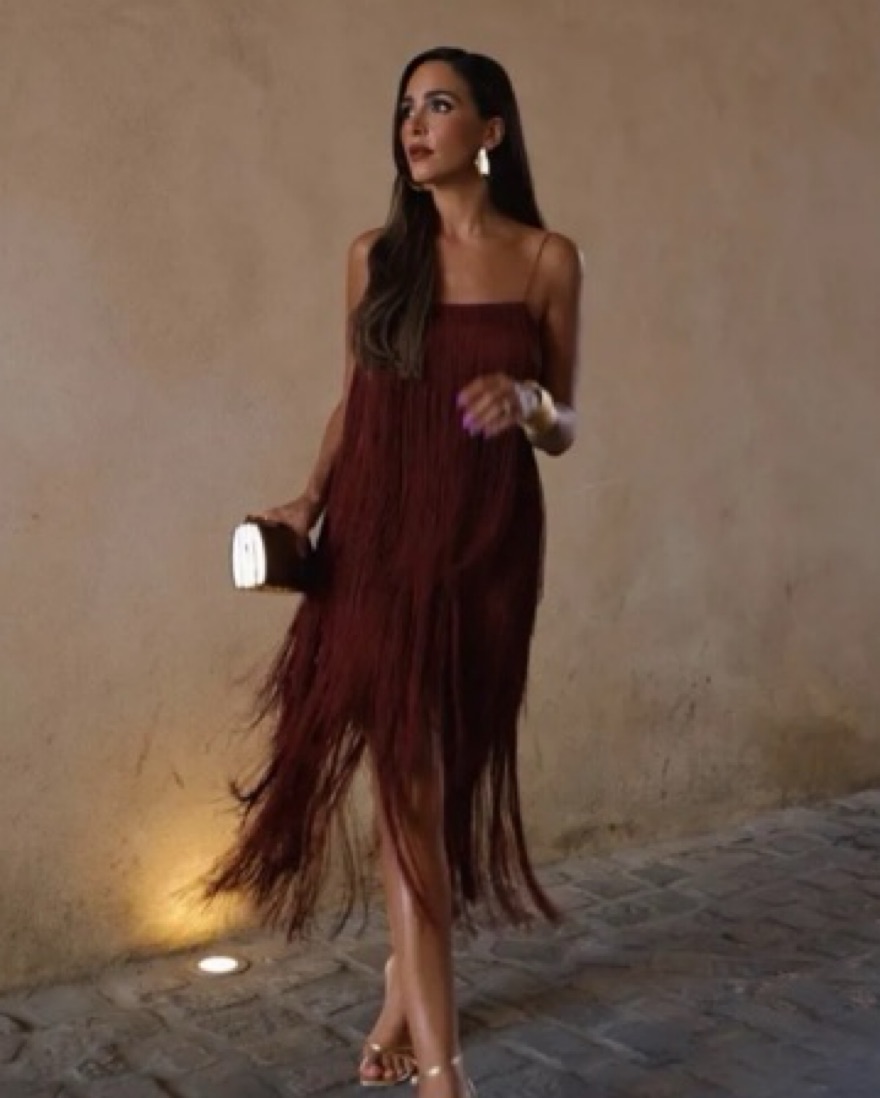 Midi dress with round neck and spaghetti straps. Tonal fringe appliqué Brown | 2712/835