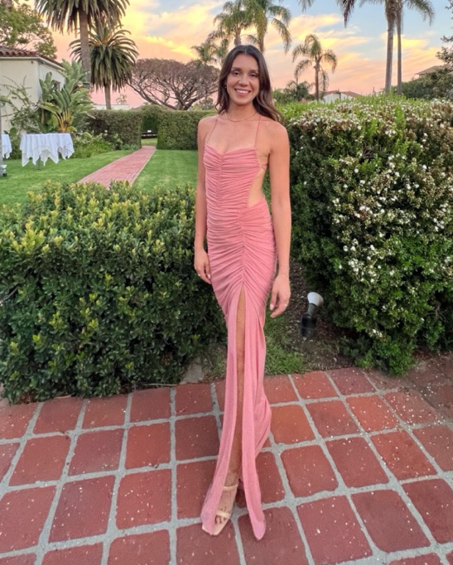 x REVOLVE Follie Gown in Mauve Michael Costello Pink party dress, wore to Santa Barbara wedding, Cutout maxi dress